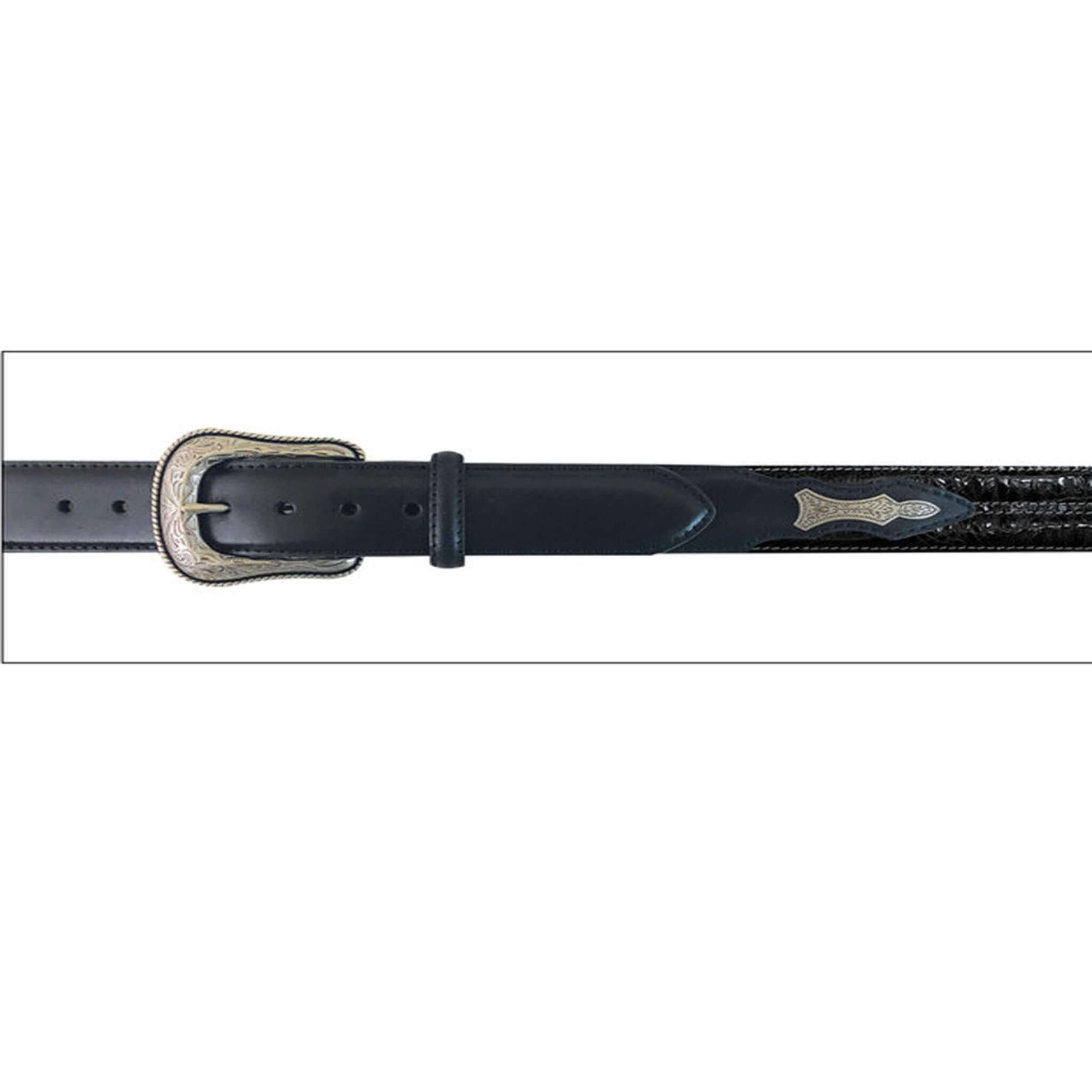 Bambino genuine leather, grooved center with two row stitch accent, end tabs with Conchos, buckle in antique nickel finish. 1-1/2" wide with removable buckle.