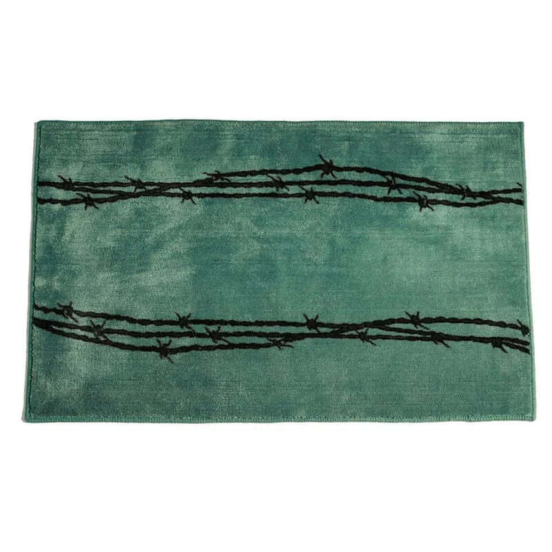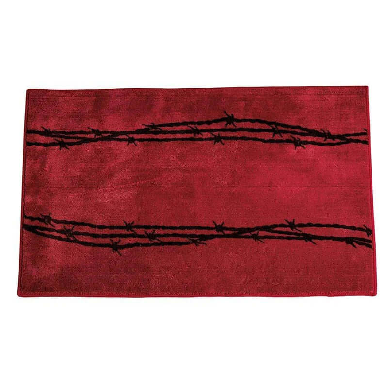 Inspired by cattle ranching, our Barbwire Kitchen/Bath Rug brings a simple rustic or Western charm to your floors with delicate barbwire embroidery set atop a rich red background. Have peace of mind wherever you place this rug because of its anti-slip latex backing. Measures 24" x 36"