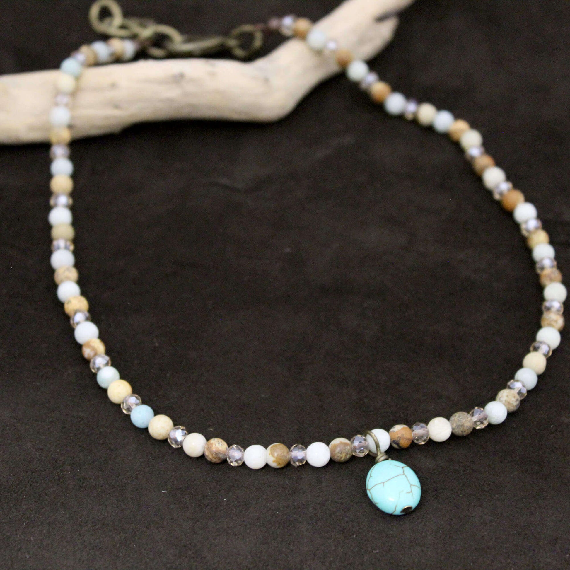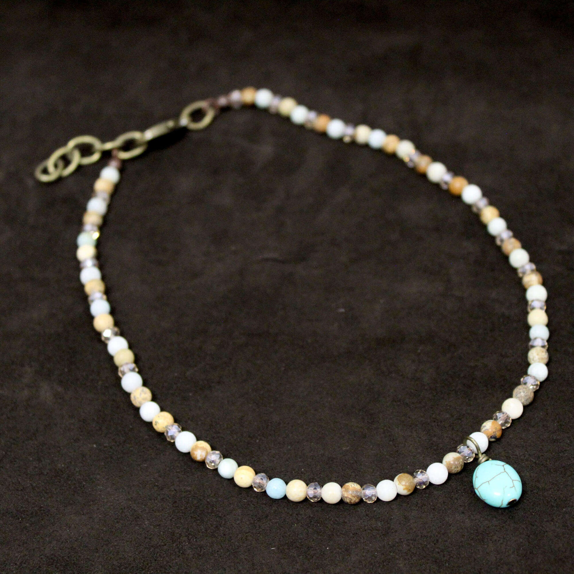 Wear it alone for a subtle sparkle or layer it with other pieces to show off your personal style. This 14-16" adjustable necklace makes a vibrant statement with its mix of beads and turquoise pendant. The mix of materials gives this choker depth and visual interest.