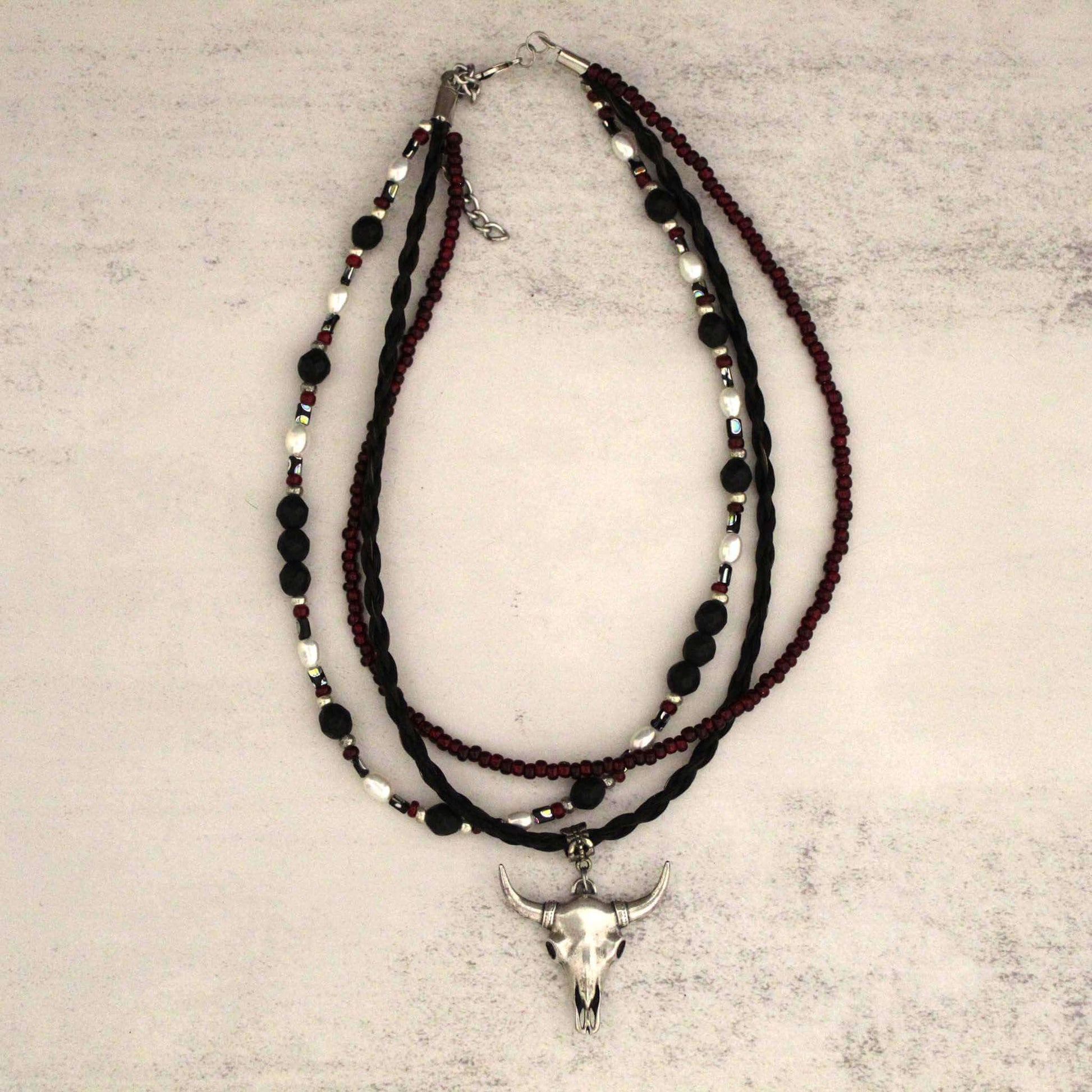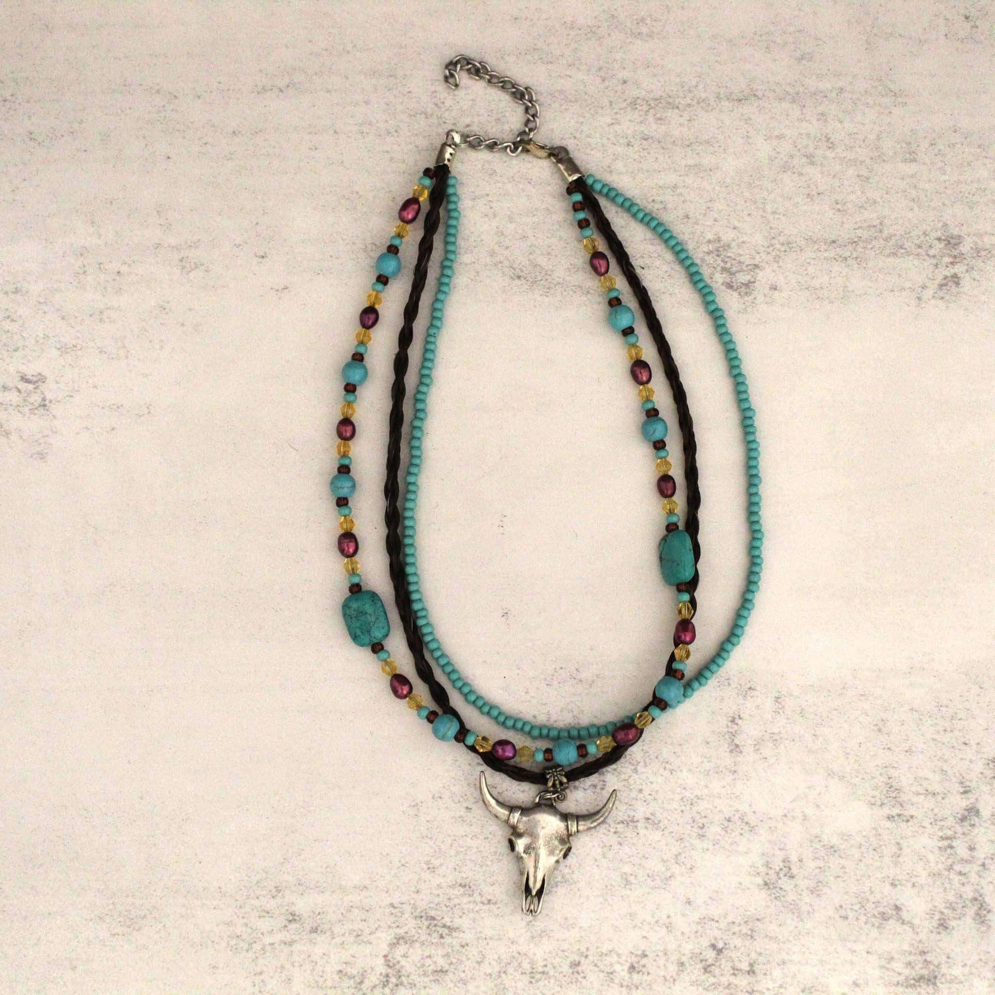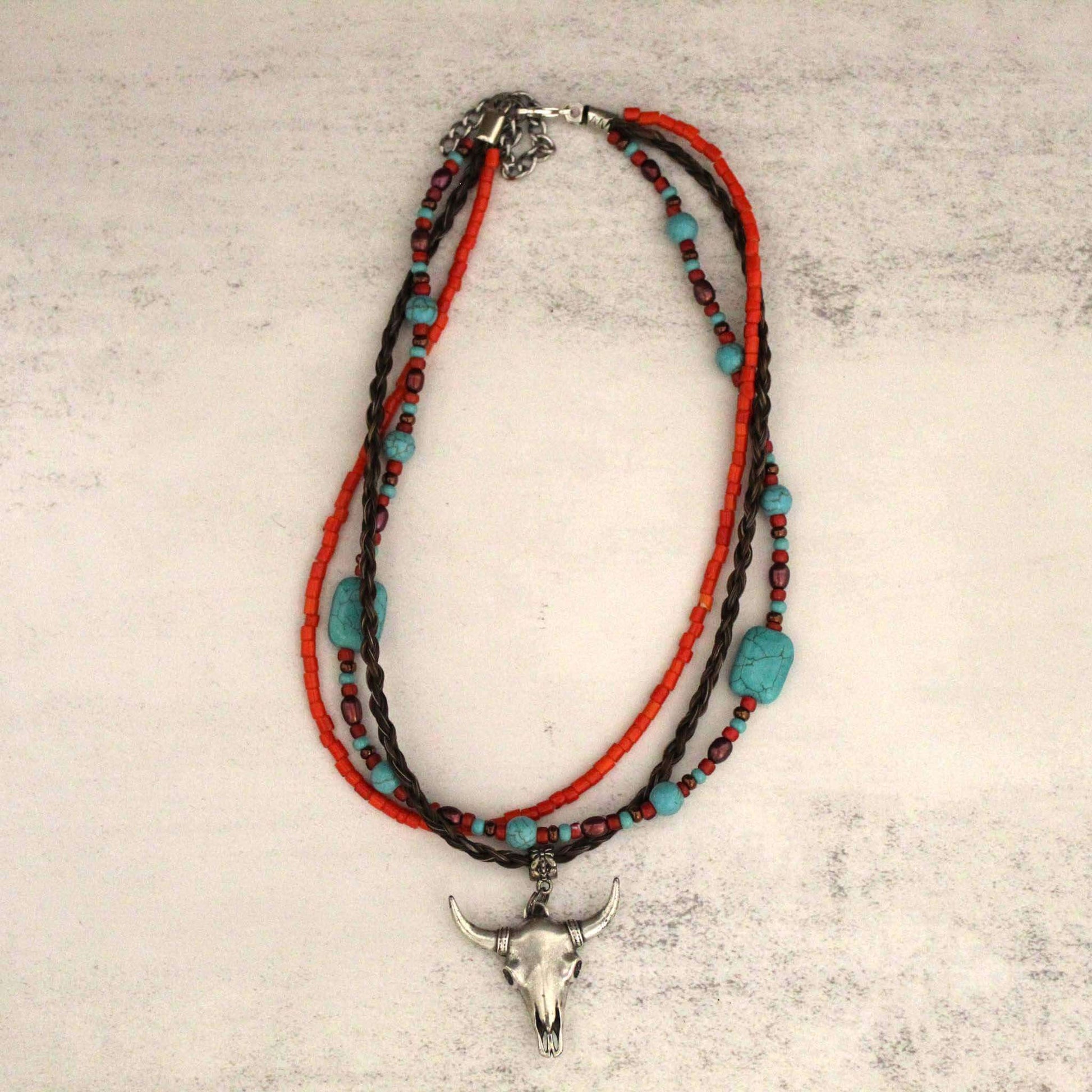 Colorful beads, pearls, and a spiral braid of horse hair are complimented by a metal buffalo skull. Necklace adjusts from 17 to 20 inches with a chain and lobster claw closure. Hang tagged.