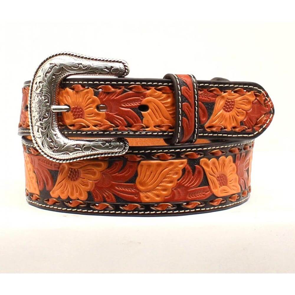 This stunning belt is made of genuine leather and features a 3 tone floral embossing and laced edges. The belt is tapered and the edges have a leather lacing. The silver engraved buckle is removable should you want to create your own style. Great belt for the cowboy who wants to look his best.