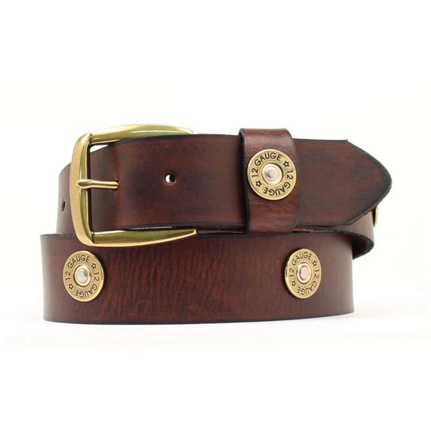 Enjoy comfort and durability from this Men's Nocona belt. Leather with 12 gauge shot gun shell conchos. Brass buckle matches the shells. Color of belt is a rich medium brown.
