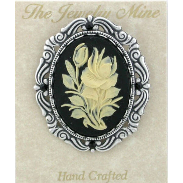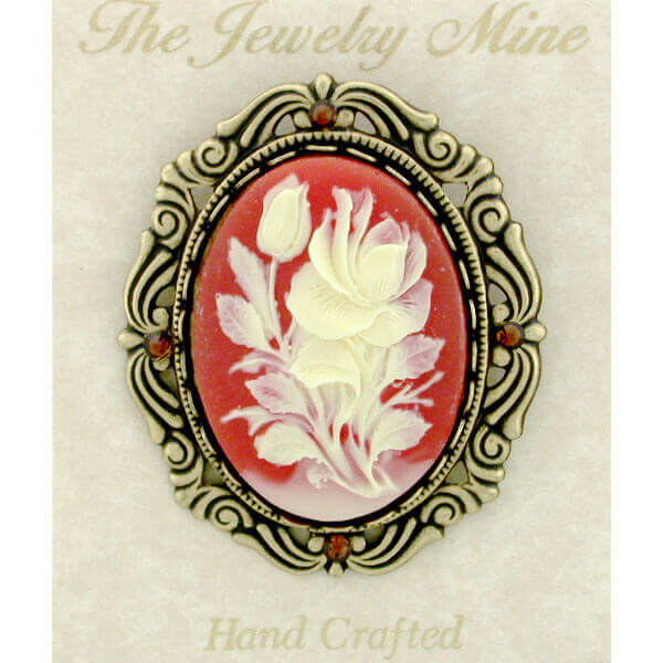 This antique reproduction flower cameo pin gives you a real heirloom look and feel at a great price! The flower cameo is set in a lace edged bezel frame with 4 crystals. Pin frame measures 2.25 inches long by 1.75 inches wide. Made in USA