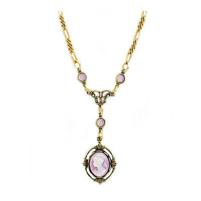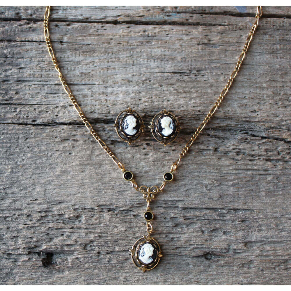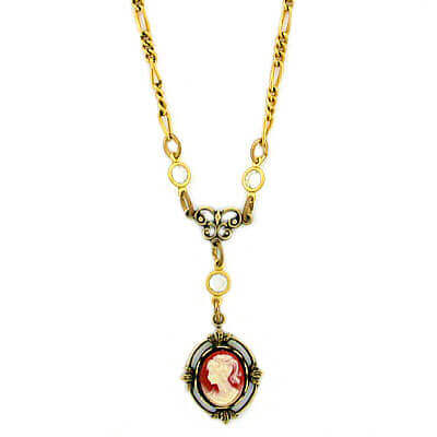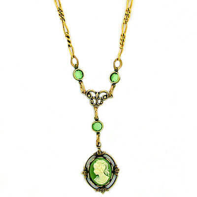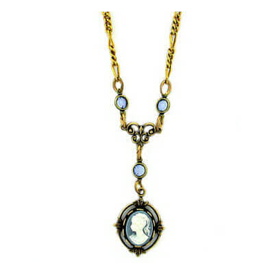 Our antique reproduction vintage style cameo jewelry gives you a real heirloom look and feel at a great price! The faux cameo is set in an antiqued natural brass flower frame. The antique gold plated Figaro link necklace chain measures 16”. The connectors are antiqued natural brass with Swarovski Austrian crystals. Earrings Sold Separately. Made in USA.