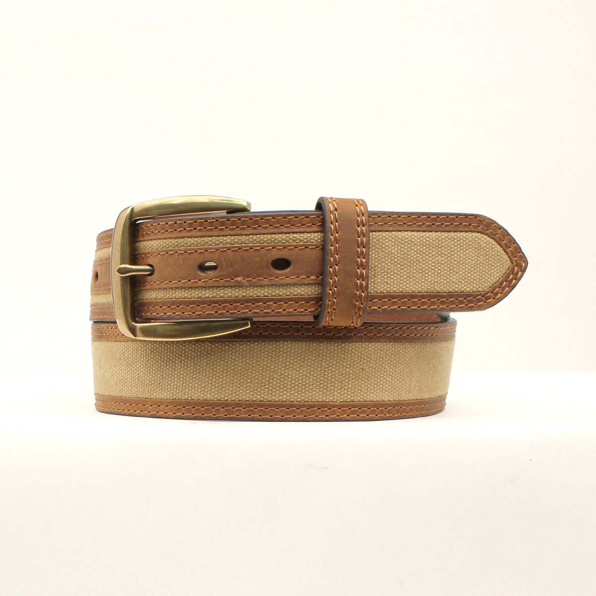 This men's Ariat belt has a great dressed up western look. The strap has a tan canvas fabric inlay with medium brown edges. The tab is accented with deboss Ariat shield logo. The buckle is removable should you wish to create your own look. You will be proud to wear this quality belt every day.
