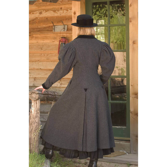 True classics never go out of style. Our Carriage Coat is the choice of frontier-minded ladies for its warmth and elegance. Make your winter travels a special occasion in the original Cattle Kate Carriage Coat. With its full frontier length and tailored fit, this handmade coat will keep you comfortable in high-style. There has never been a more exquisite coat with details such as black velveteen trim, side pockets, tucked leg-of-mutton sleeves, two kick pleats in back and handmade passementence buttons. It is fully skirted to accommodate Cattle Kate dresses and petticoats. Lined in heavy satin polyester. Available in 100% wool.