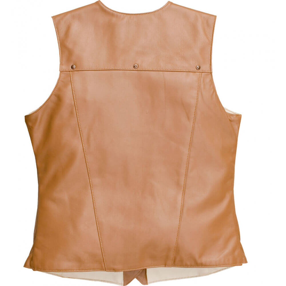 Whether you are attending your local Rodeo or saddling your horse, you’ll look fierce yet feminine in this all leather vest. This soft leather vest is styled with front and back yokes decorated with copper hammered studs. Two front pockets to keeps your necessities in and a front copper snap closure. Made of Lamb leather in a rich tobacco color and lined in polyester. Dry Clean. Made in USA.
