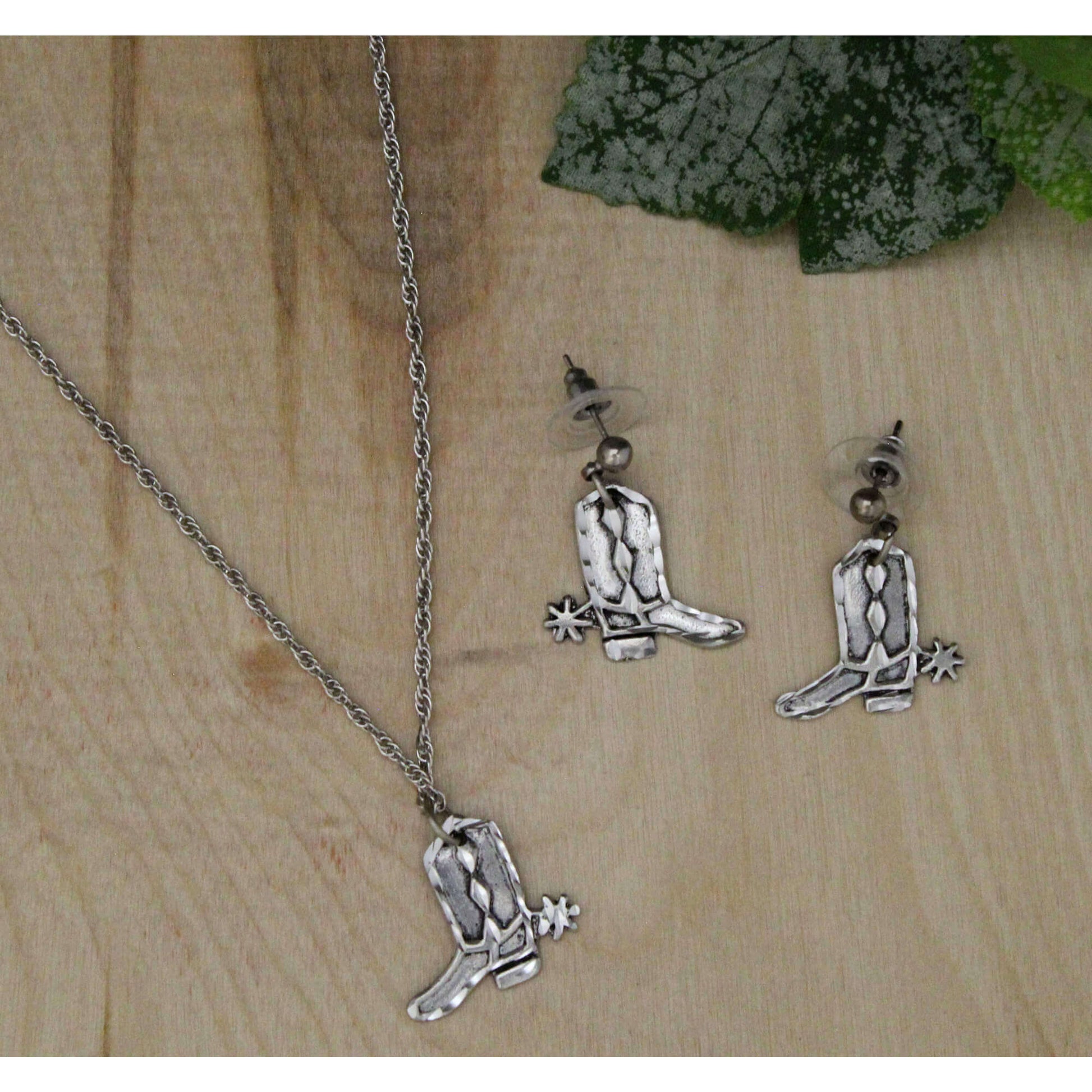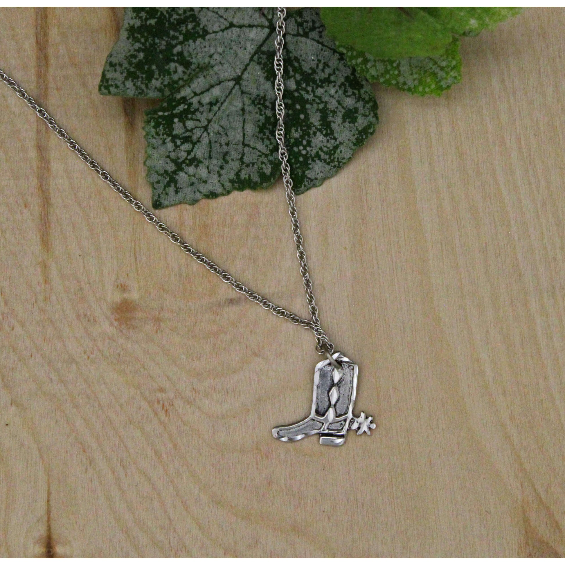 Destiny pewter jewelry are made of fine jeweler's pewter that is extremely lightweight and has a brilliant shine. each piece is handmade and hand finished with diamond cuts. The sparkly cuts give each piece a unique dazzling sparkle. Approximately 1" on an 18" chain. Matches our Pewter Boot Earrings. Sold Separately. Made in USA