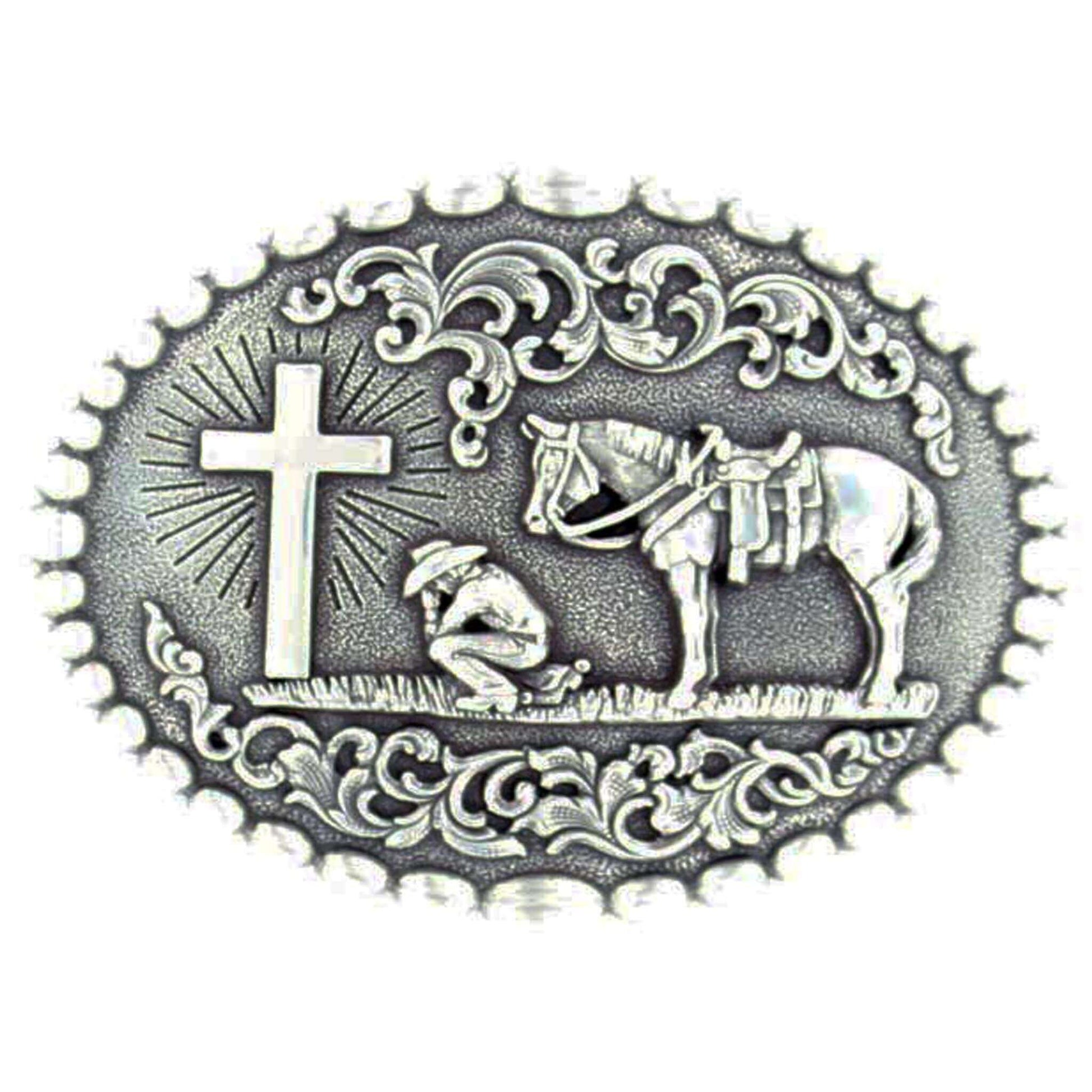 Silver Nocona buckle with beaded edge and Cowboy kneeling at Cross with his trusted horse behind him. A raised floral design perfectly complements this reverent design. Oval measures approx. 3" x 4".