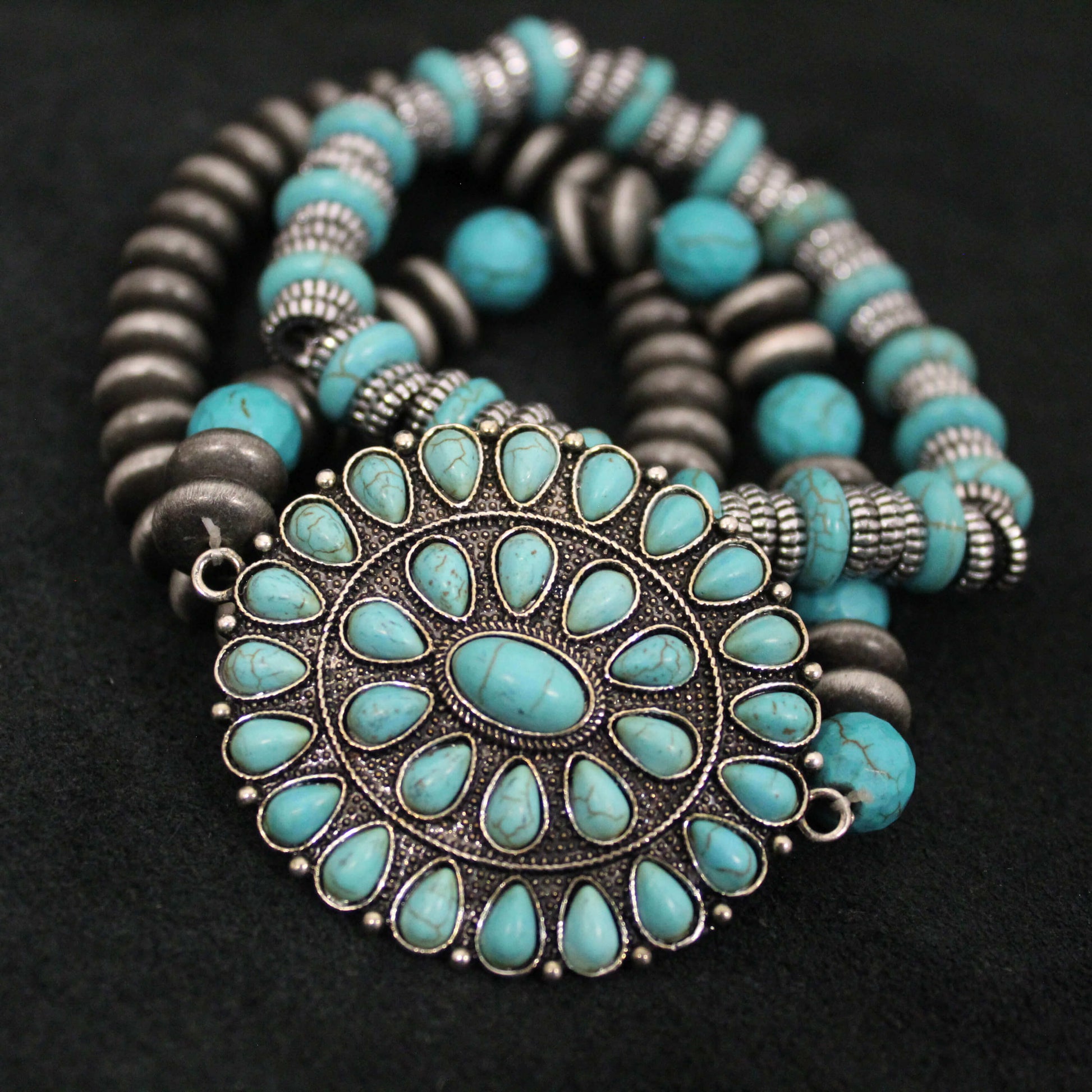 Western design with three turquoise faux stones measuring 2″ wide and fits all wrists.