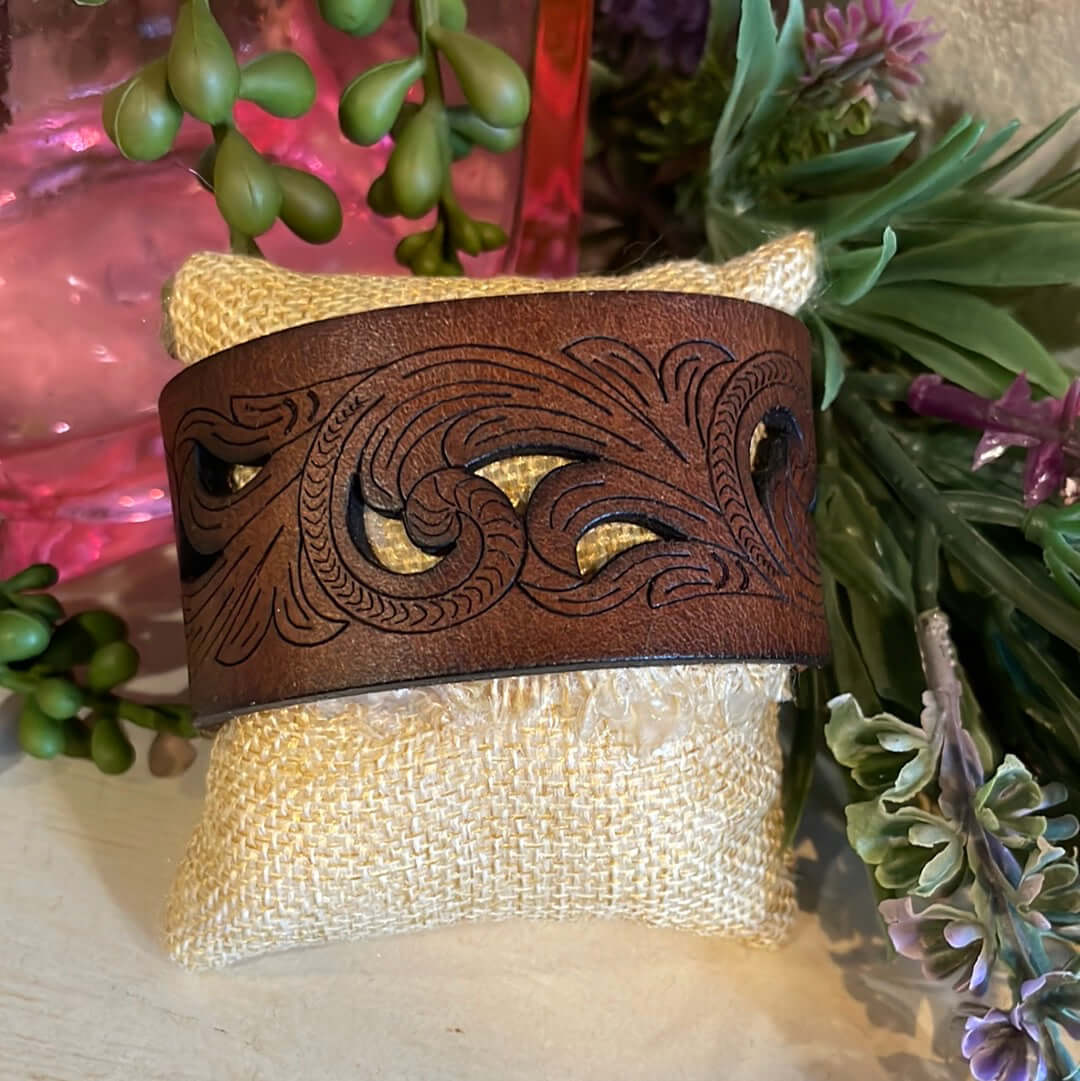 With its artful scrollwork cutouts, this leather cuff bracelet adds a touch of boho chic flair to any outfit. The brown leather plays with light and shadow, creating visual interest. Slip this bracelet on with jeans and a tee or dress it up with a cocktail dress for an effortless style statement.
