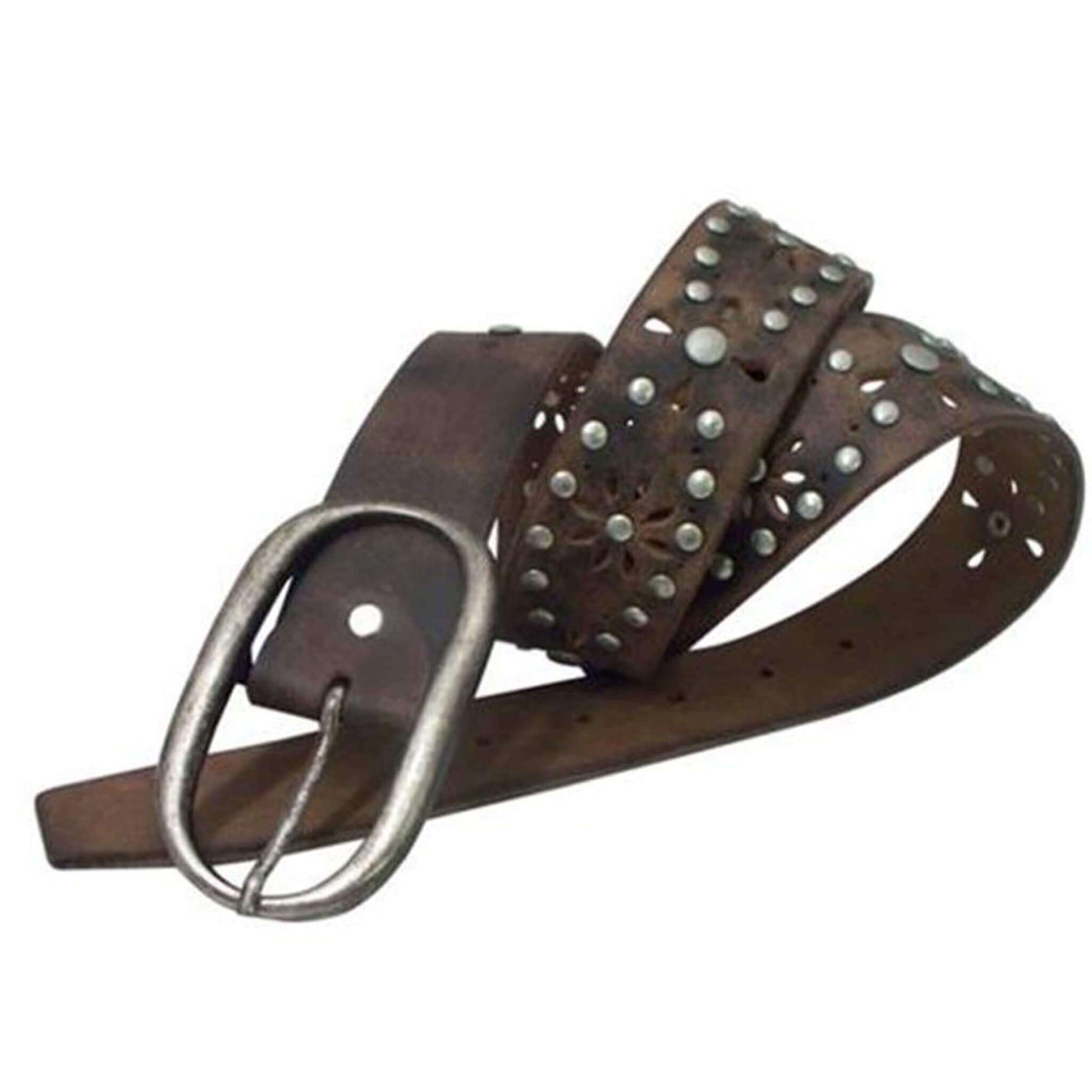 Floral Leather Belt has a genuine leather construction for an attractive look. The floral cutouts and nail-head floral design extends down the full length strap of this women's leather belt for style. This Cowgirls Rock leather belt measures 1-1/2 in. wide. Get this floral leather belt to stand out at your next event! Removable Buckle. Imported.