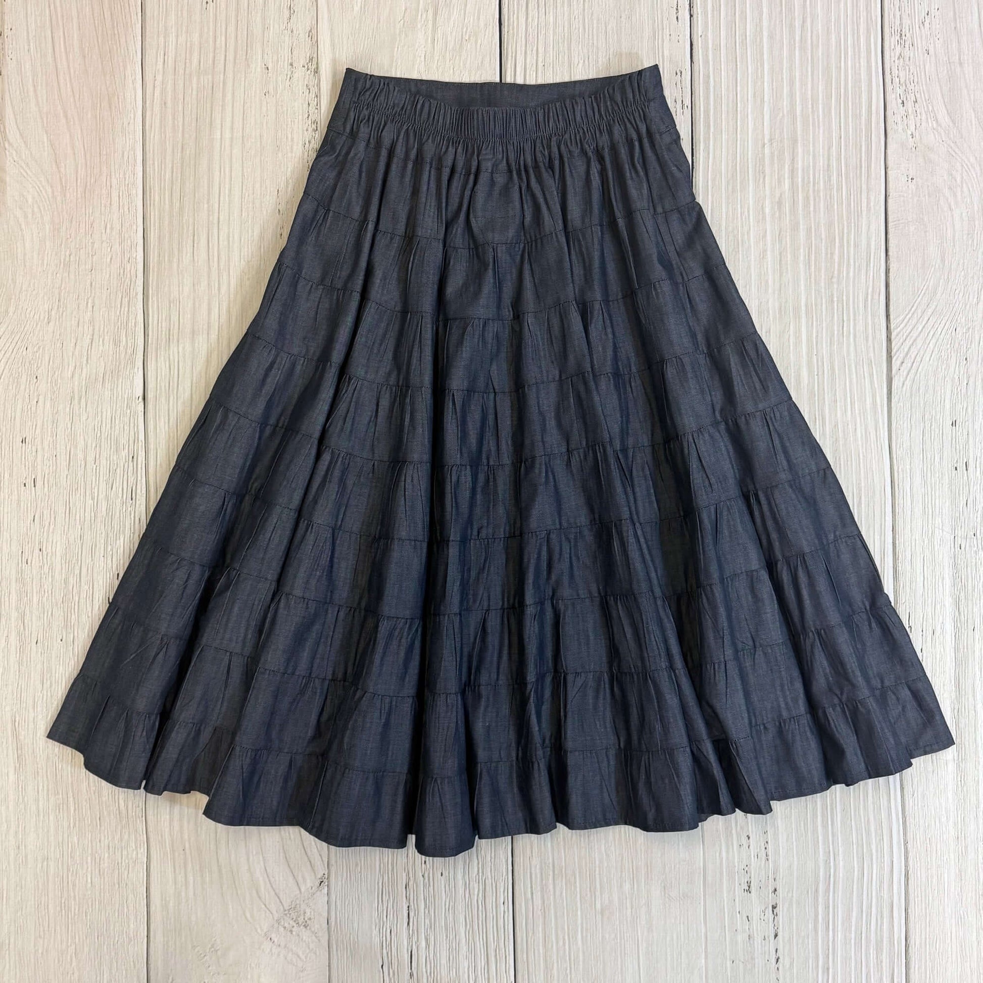 A great western skirt in the traditional "broomstick" style. Nine tiers of indigo cotton denim create the perfect flair in this cowgirl skirt. Features include a comfortable wide waistband with elastic in the back for a nice fit and a decorative leather trim and tie in the front. Measures 34" long.