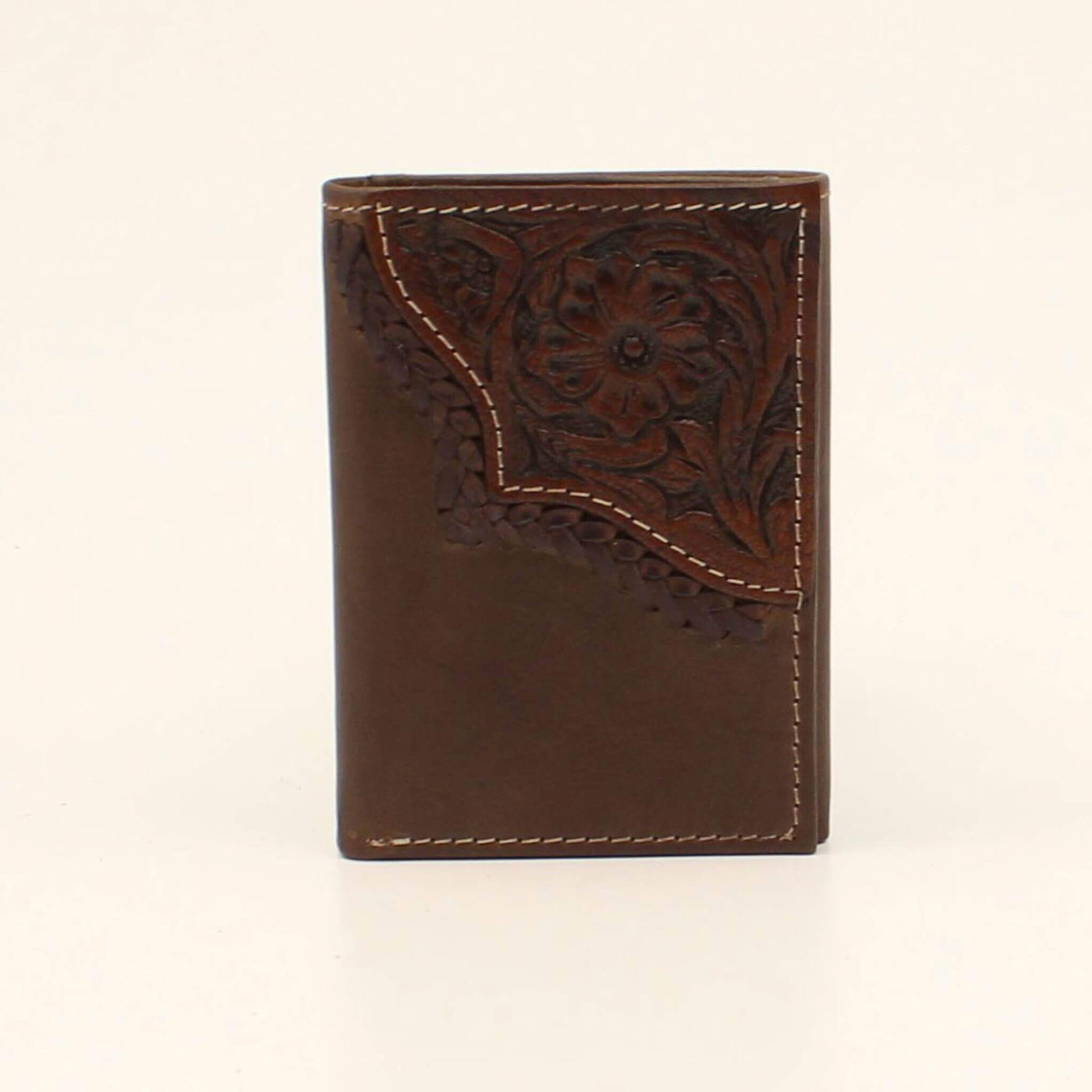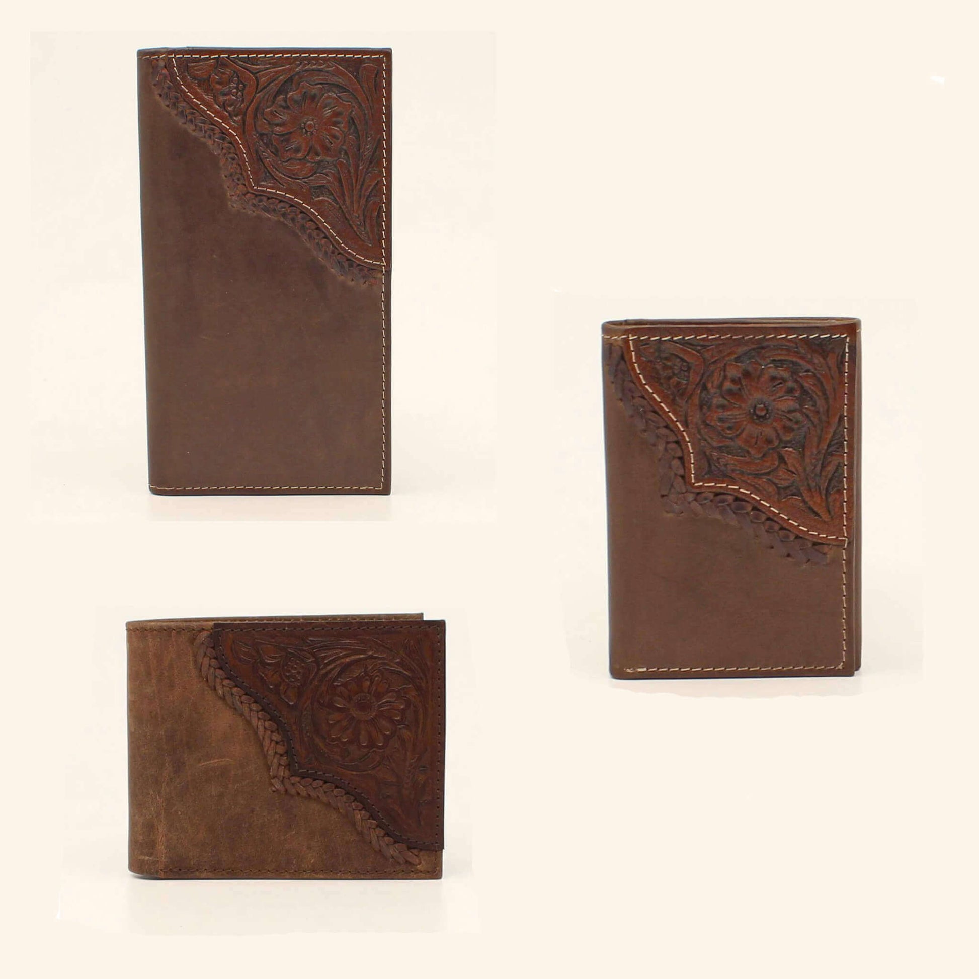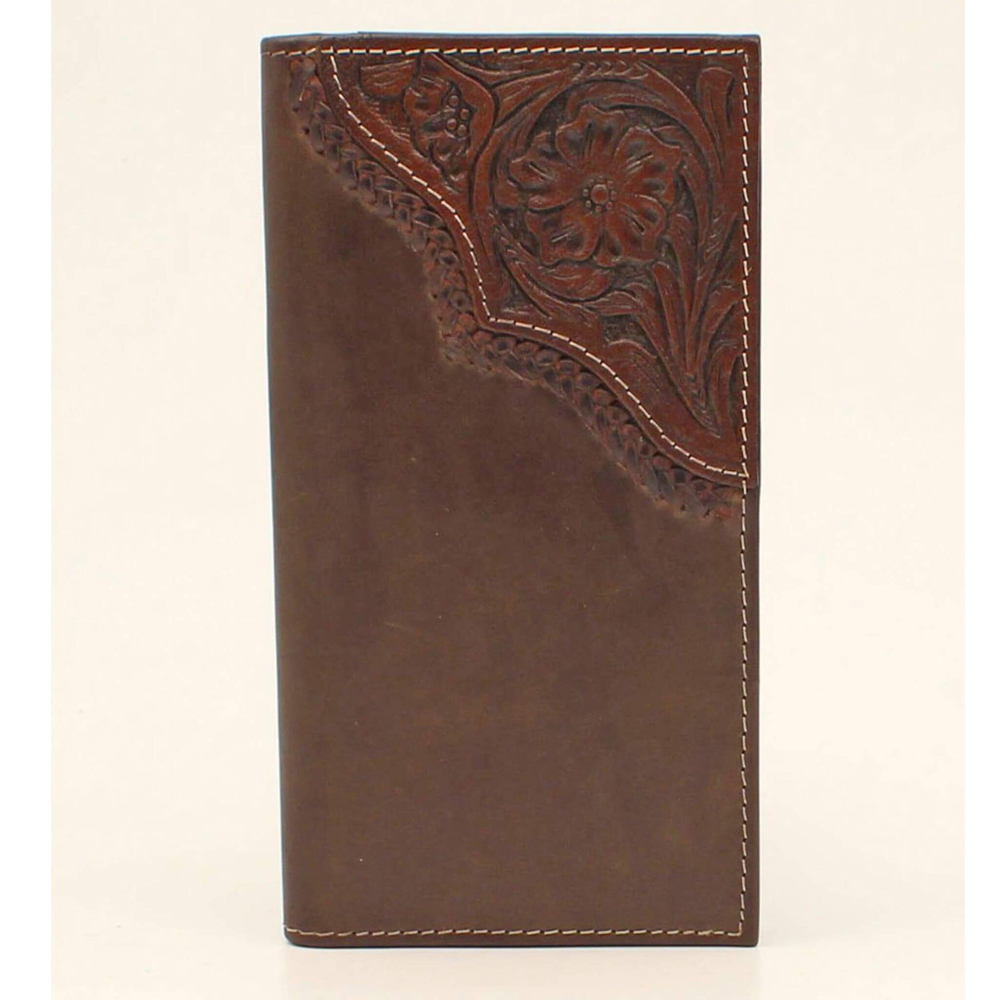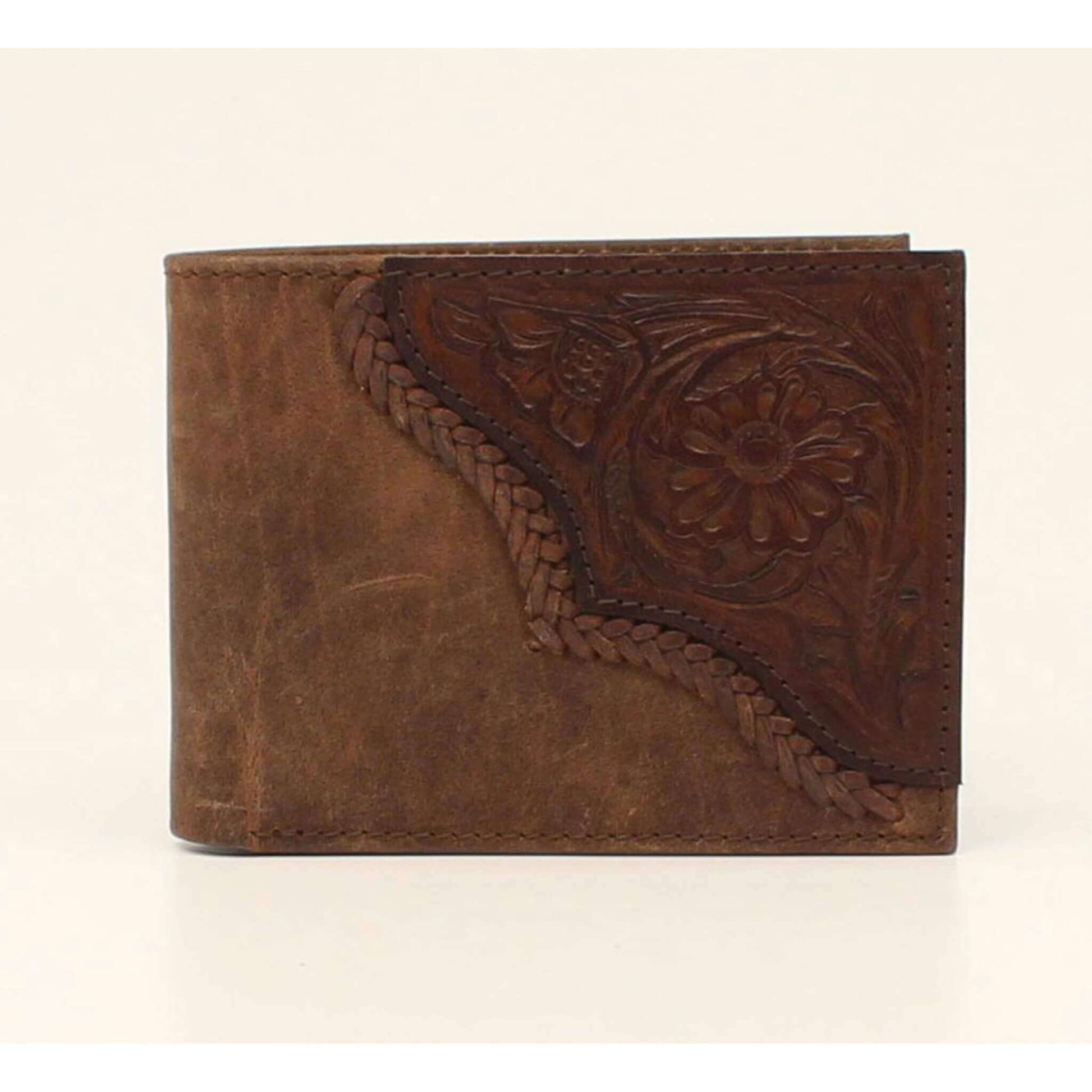 This Nocona leather has a floral tooled upper right corner. Beautifully accented with a braided leather edge.