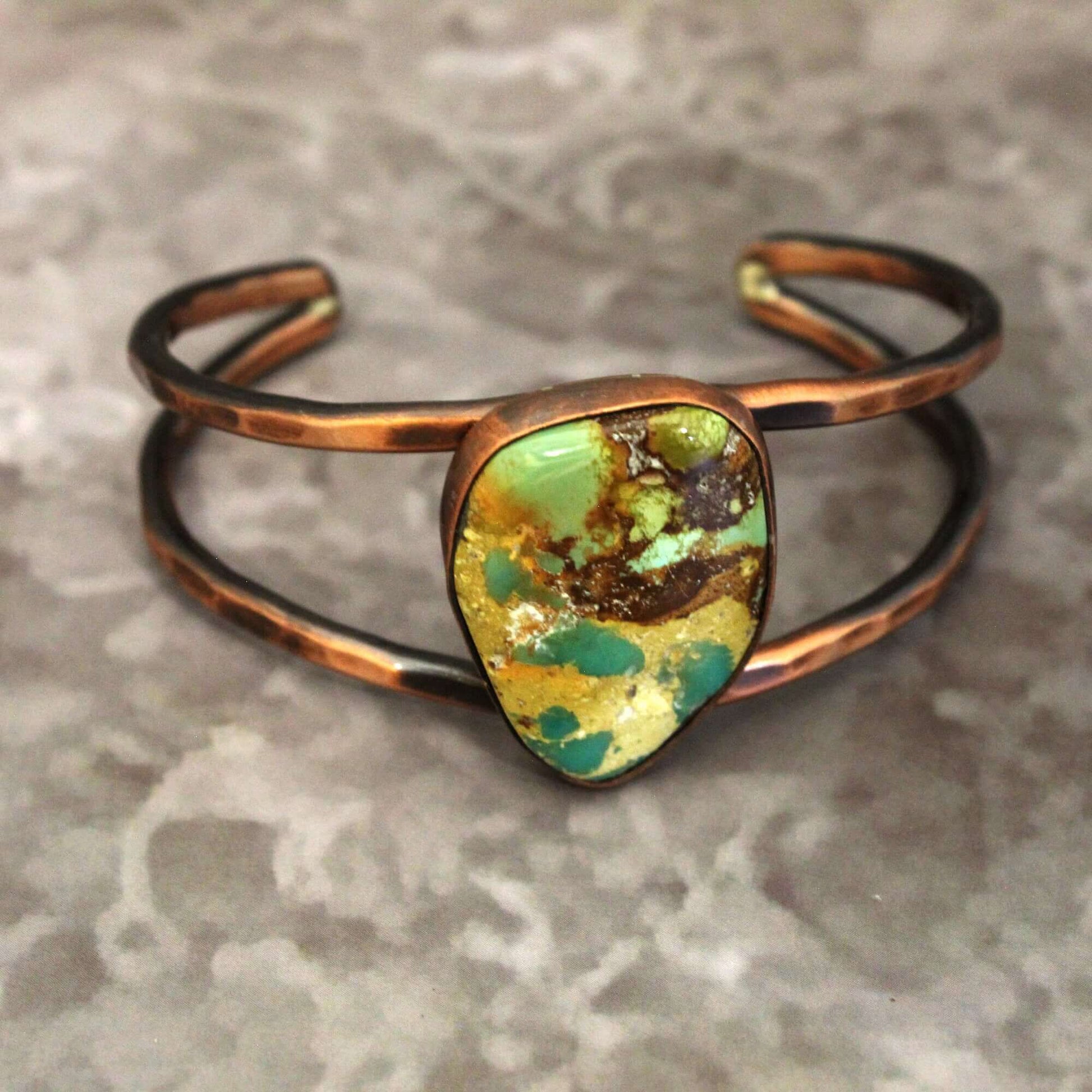 Slip on the Genuine Handcrafted Turquoise Copper Cuff Bracelet to add a touch of natural elegance to your day. Whether you're dressing up for a special occasion or simply want to add some flair to your everyday style, this bracelet is sure to become a go-to piece in your jewelry collection. Treat yourself or surprise a loved one with this truly unique, handcrafted accessory. Crafted with care by a husband and wife team in the USA