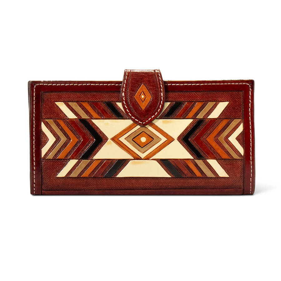 This luxurious wallet isn't just a stylish accessory - it's a functional work of art that will elevate your everyday carry. The intricate southwest pattern adds a touch of southwestern flair, while the multiple card slots and zipper pocket keep your essentials organized. The magnetic tab closure ensures your contents stay secure and only get better with age. Treat yourself or gift this stunning wallet to the fashionable woman in your life. Measures: 8-1/4 x 4. Made in India