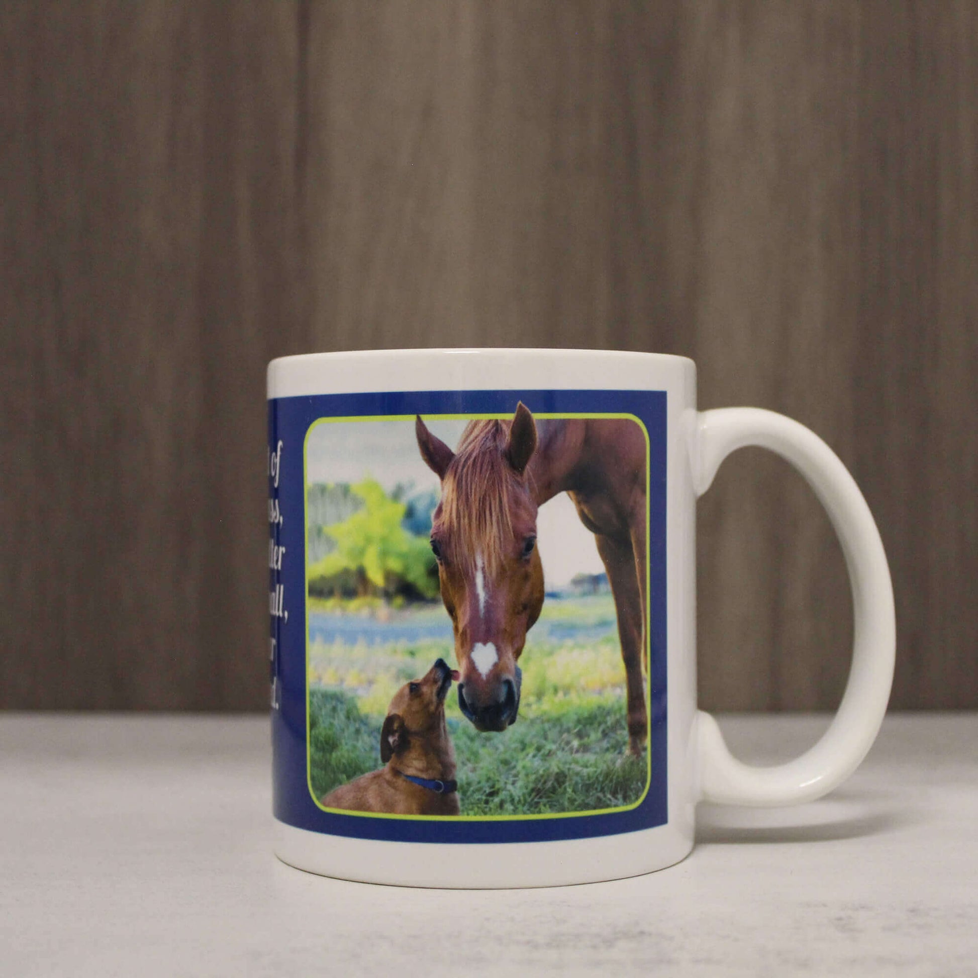 Delightful western coffee mug captures sweet image of horse and dog representing friendship and kindness. This 12-oz ceramic mug come with sturdy box making it ideal for gift giving. Dishwasher safe, too!
