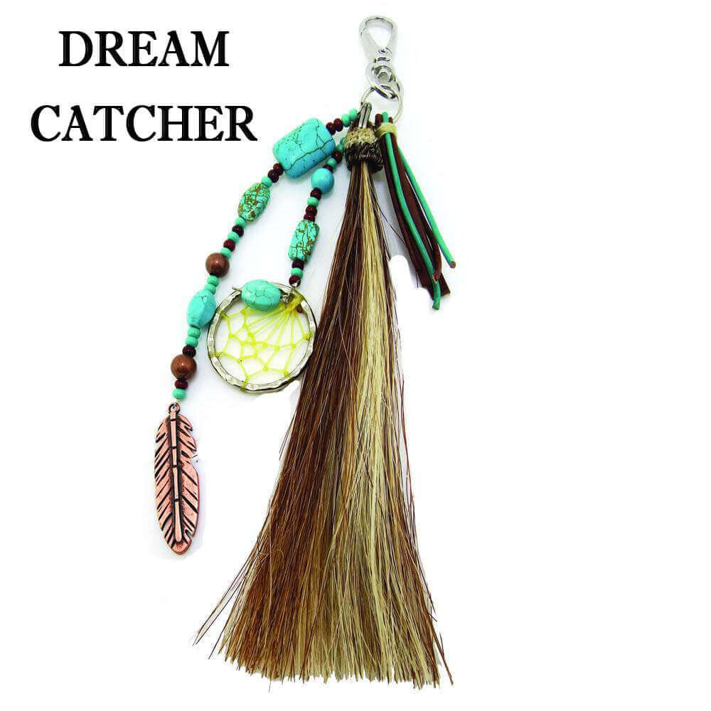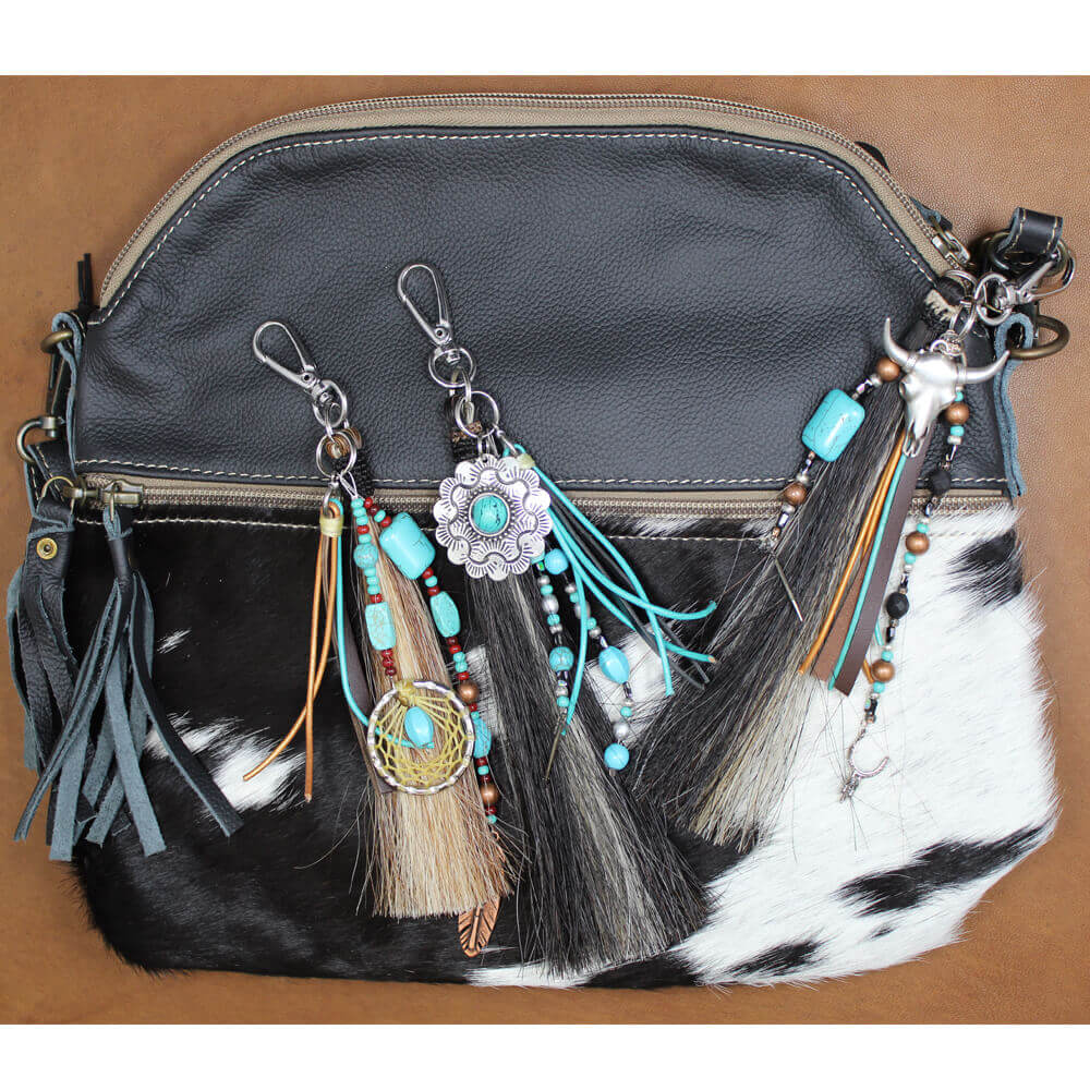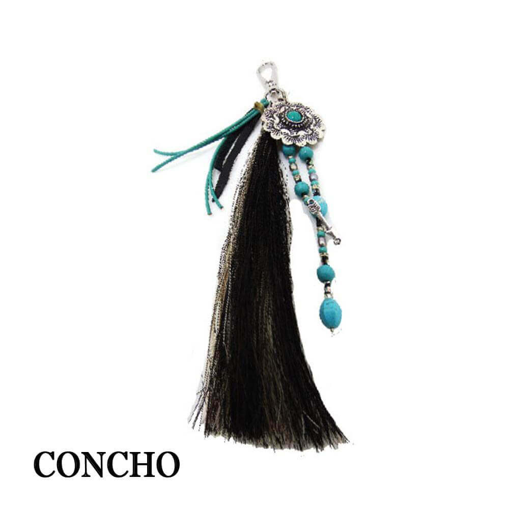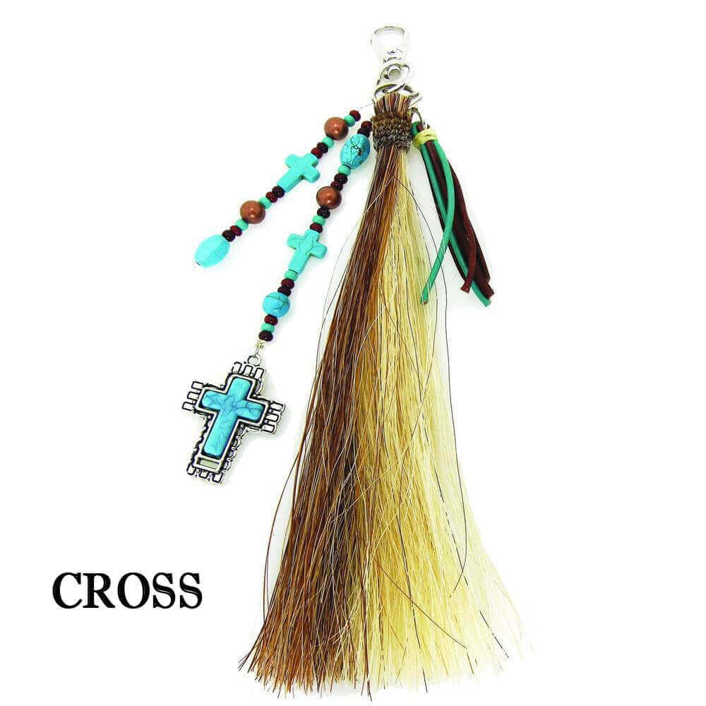 A tassel made from two colors of genuine horsehair is finished with a handwoven horsehair knot. Each tassel has its own unique adornments and may vary slightly from images. Measuring 9 inches including sturdy swivel hook. Use on purse, bags, home décor, crafts, anything you can clip to! Choose from five designs. Handcrafted in the USA.