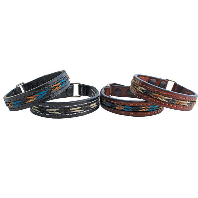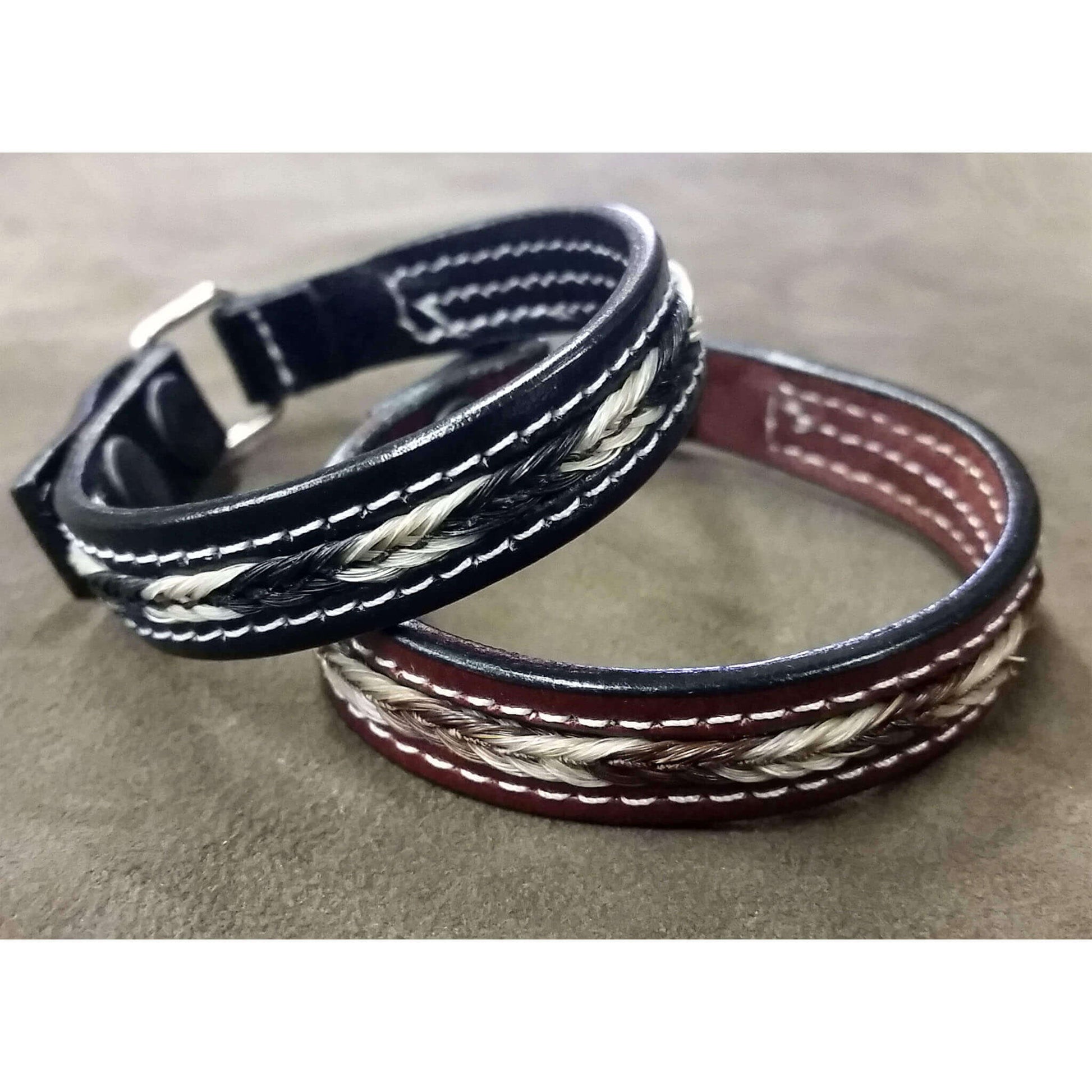 These western style bracelets are a great combination of simple and stylish. Features an inset of braided horsehair down the middle of a leather band in either brown or black. Measures 1/2" wide. Two snap closures at 6-1/2" and 7".