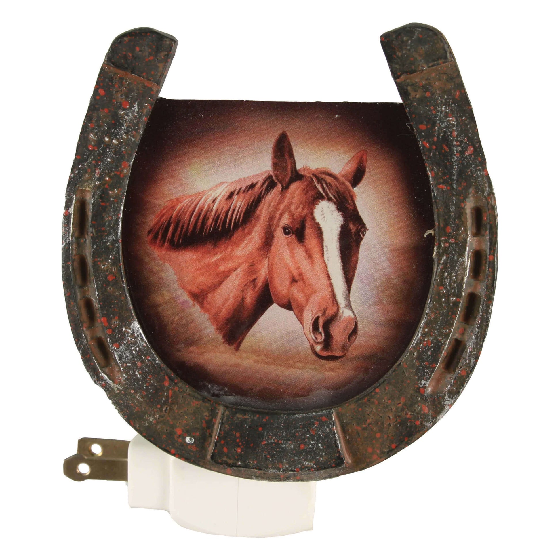 The horse night light showcase an image of a horse with a horse shoe border. Features an automatic on/off sensor, and fully adjustable rotating head. The rotating head is constructed of a durable hand painted poly resin with excellent attention to detail. The light operates on 120V AC and includes a bulb. The light is also UL approved. Light up any bedroom or bathroom in style. Makes for a perfect gift idea for any outdoor enthusiast. 6x4x2