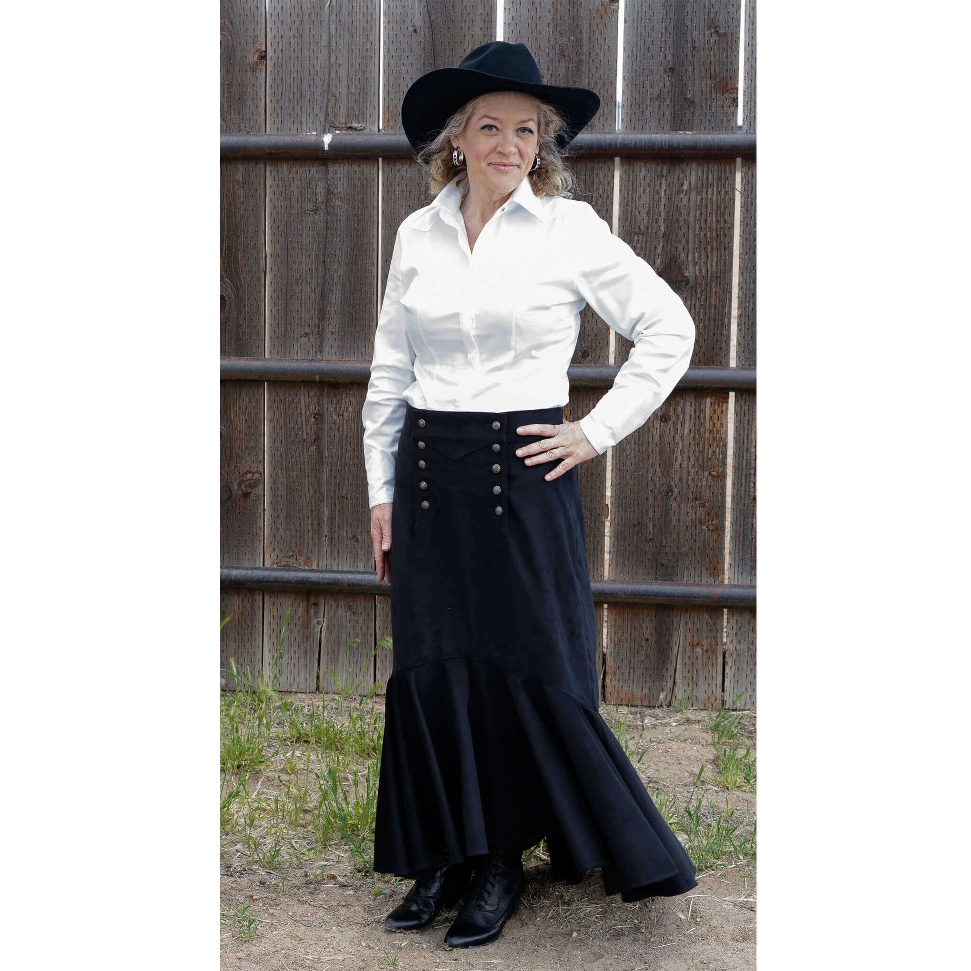 Derived from our popular 1800’s Riding Skirt pattern we have took out the split skirt and added a 16" ruffle along the bottom to create this flirty look. Cut with a slight flair and front button flap opening. Made in soft suede polyester. Skirt is approximately 35" long. Made in USA.