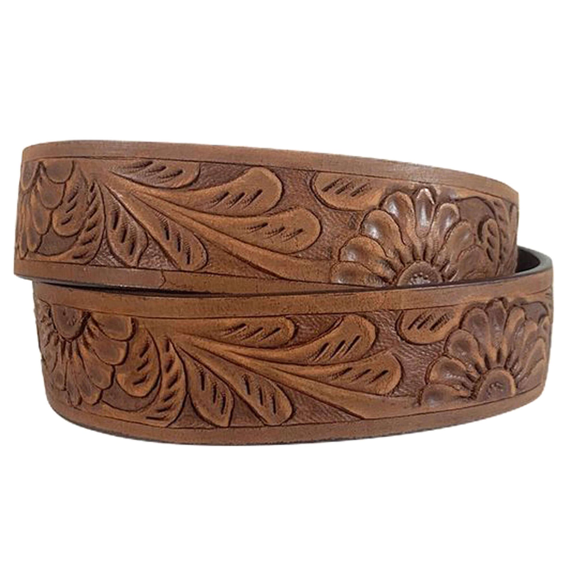 Genuine Leather belt with two toned floral hand tooled strap, cut non-stitched edges, and buckle in Antique Brass finish. 1-1/2" wide with removable buckle.