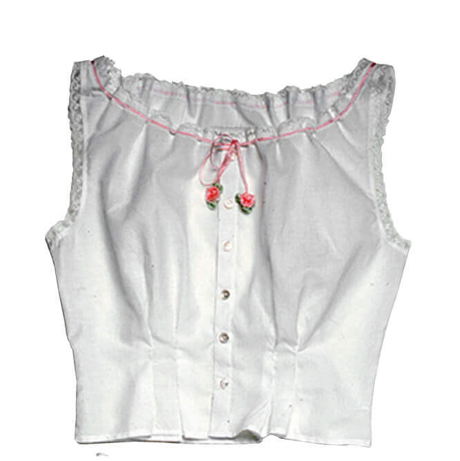 This is the Cattle Kate way to feel like a lady. This camisole, which also makes a lovely summer top, is trimmed in lace, ribbons and rosettes. Looks darling with pantaloons or a petticoat. 100% fine cotton batiste. Made in USA