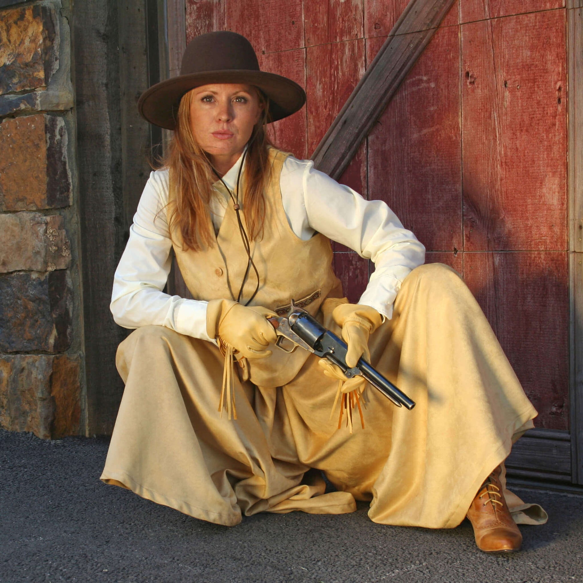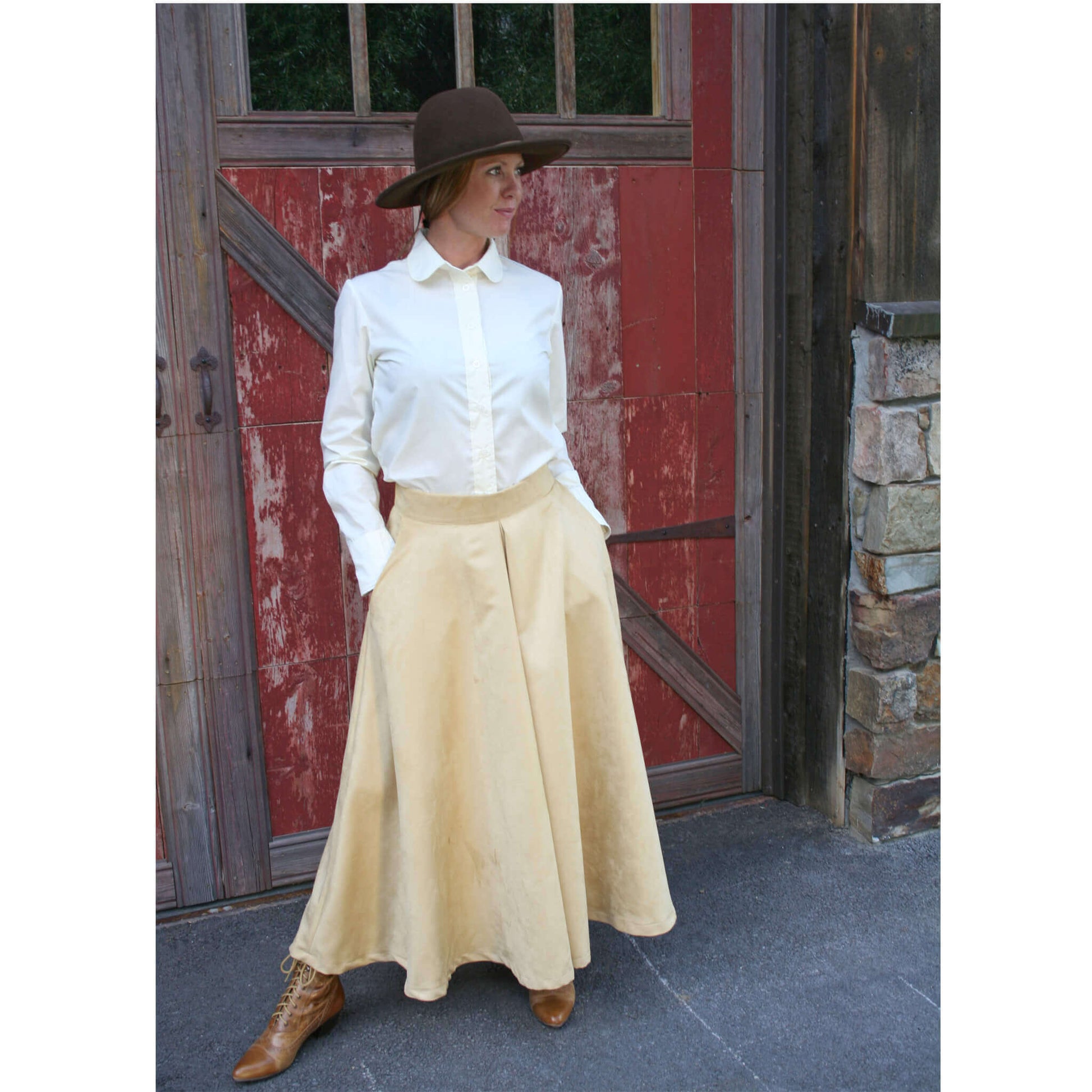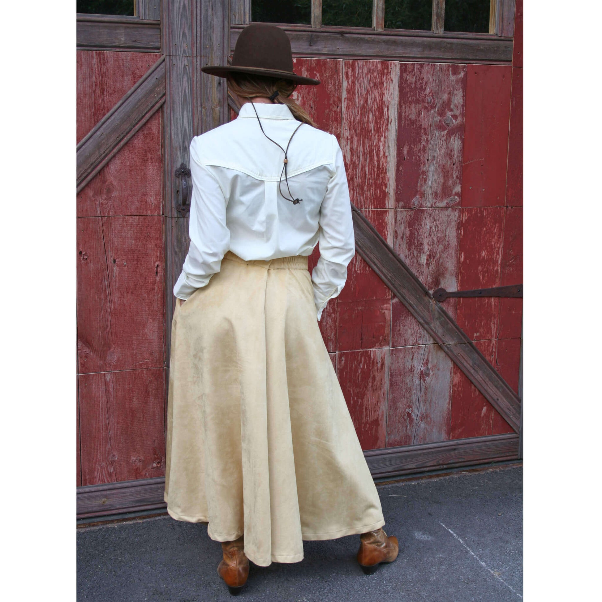 Our classic Riding skirt made of polyester suede in a golden buckskin color with a matching vest. The split Riding Skirt is cut wide with pleats in the front and back with elastic in the back waistband for an easy fit. It zips in the back with a button on top and has two side pockets. Approximate length 35" 100% Suede Polyester. Dry Clean Recommended. Made in USA
