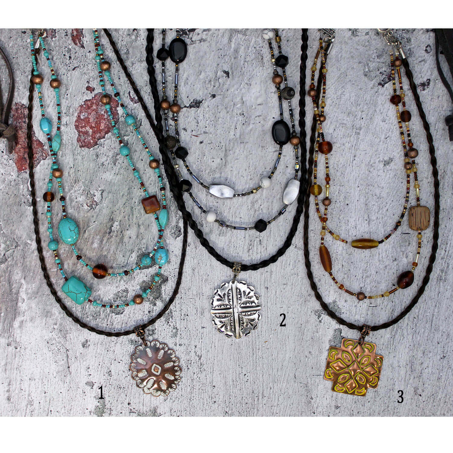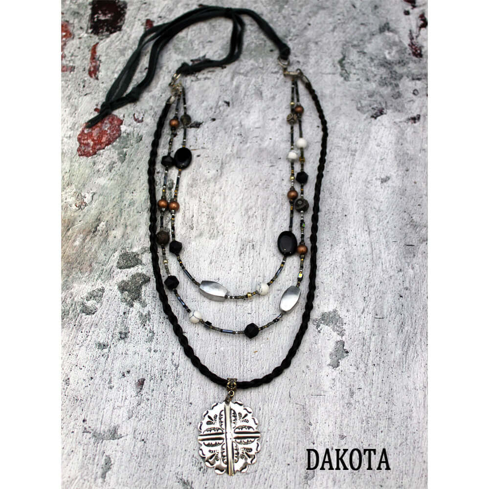 2. Dakota- Go from day to night in the classy Dakota Necklace. Shimmering metallic copper and silver beads are complimented by shades of neutral seed and glass beads. A single spiral of braided horse hair boasts the Dakota shield concho pendant.