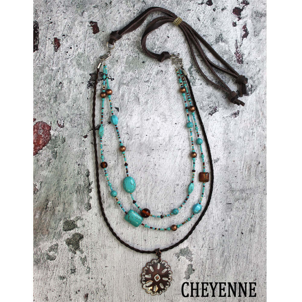 1. Cheynne- Bloom like the high desert plains in this enchanting turquoise necklace. A variety of howlite turquoise chunks are offset by copper round, teardrop and flat metallic beads with glass seed beads. The classic copper pendant hangs from a single strand of braided authentic horse hair.