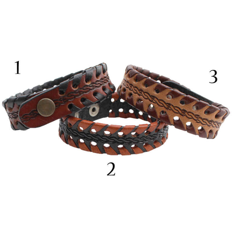 These western leather bracelets come in a variety of color combinations. Contrasting whipstitch along the edge with an embossed barbed wire-like scroll down the center. Bracelets measure ¾” wide with snap closure and fits approximately 7-½” to 8-¼”. Made in USA.