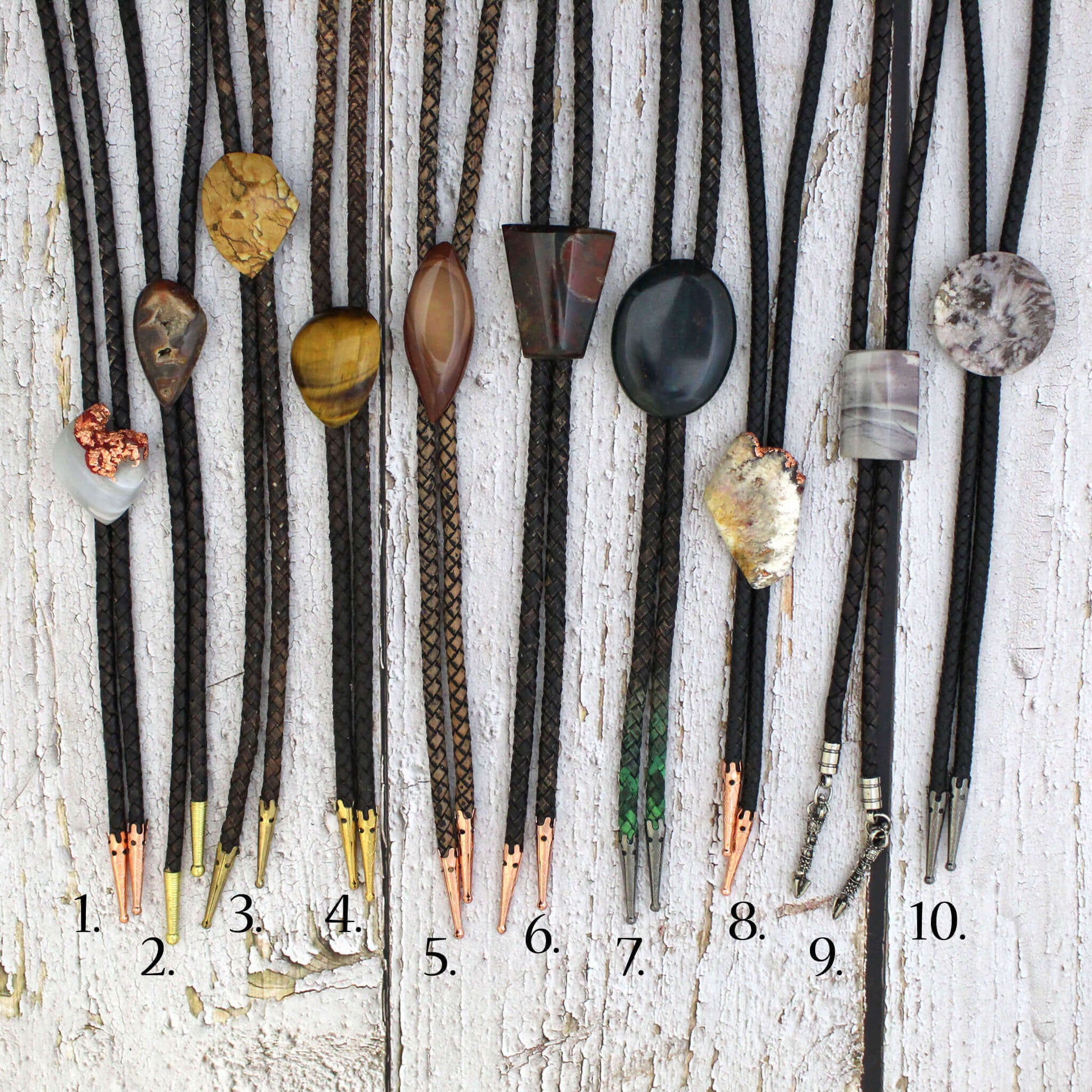 Beautiful unique gemstone bolo ties handcrafted in Idaho. Craig Murdock cuts and polishes different genuine gemstones making each piece a one of a kind. Every stone comes on a sturdy leather cord with correlating metal tips. Measures 36" from tip to tip. Limited Stock! Only one of each style available so get yours before its gone!
