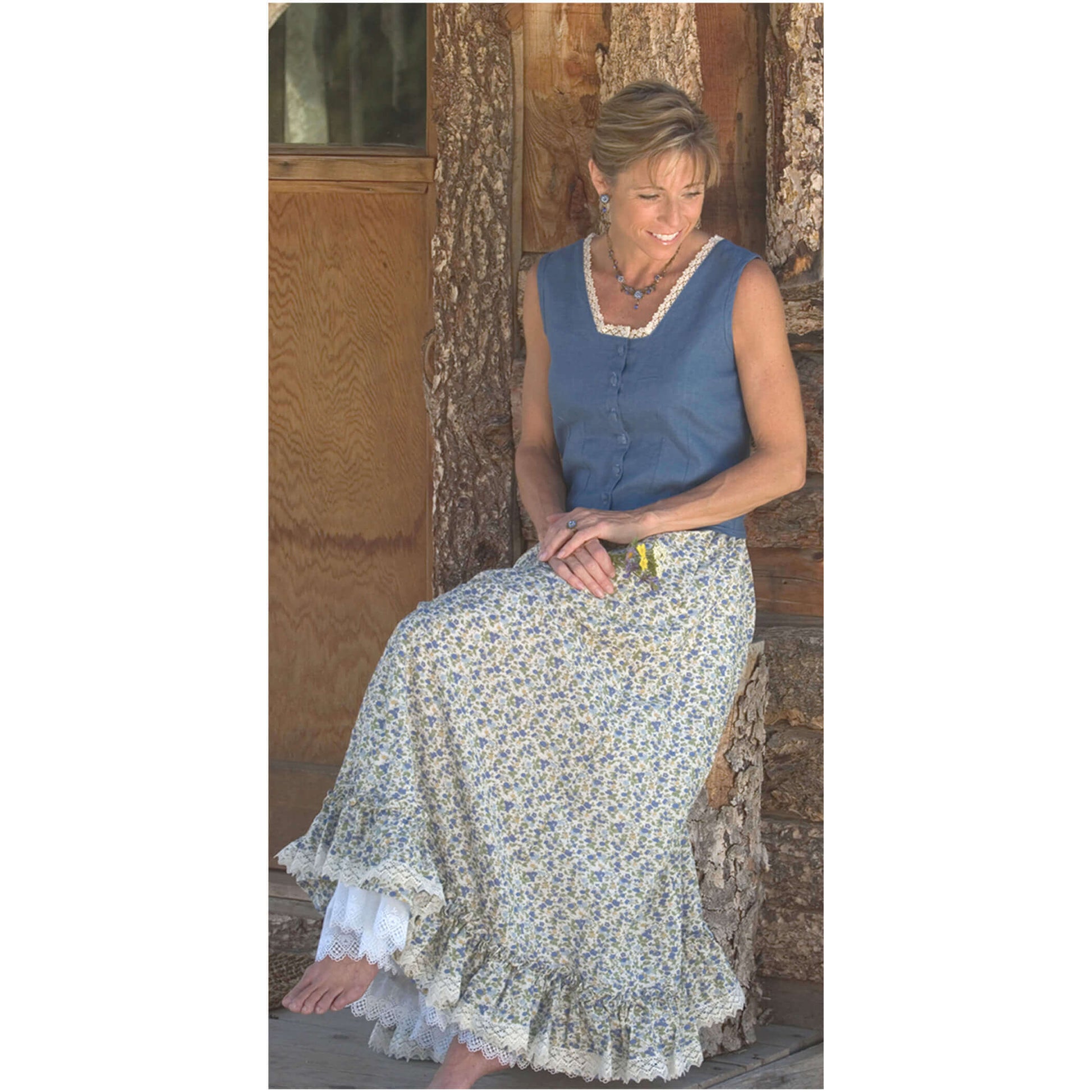 This one ruffle Low Step'n Swisher Skirt is made of 100%cotton rippled gauze. The fabric design features feminine blue flowing flowers on a cream background that blends perfectly with the Denim Corser Cover as shown. The bottom ruffle is trimmed in Ecru cotton lace, which also matches the lace in the camisole. This skirt features two inseam side pockets, eight gores for fullness, substantial waistband that's flat in the front and heavily gathered by elastic in the back for that sweep of bustle fullness.