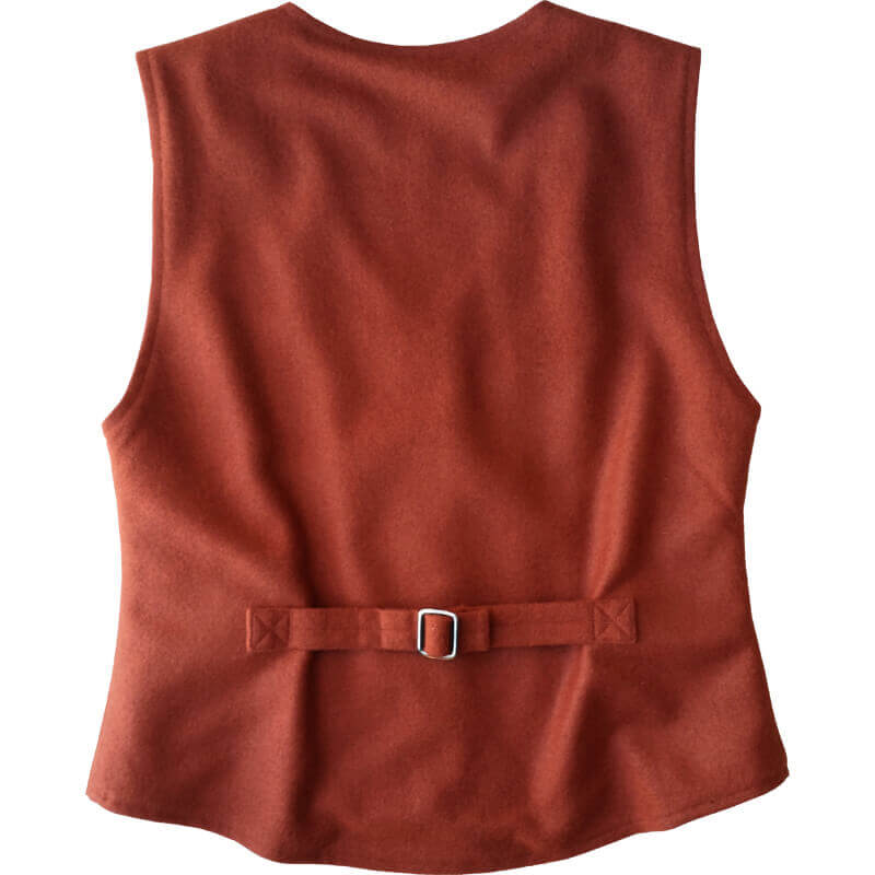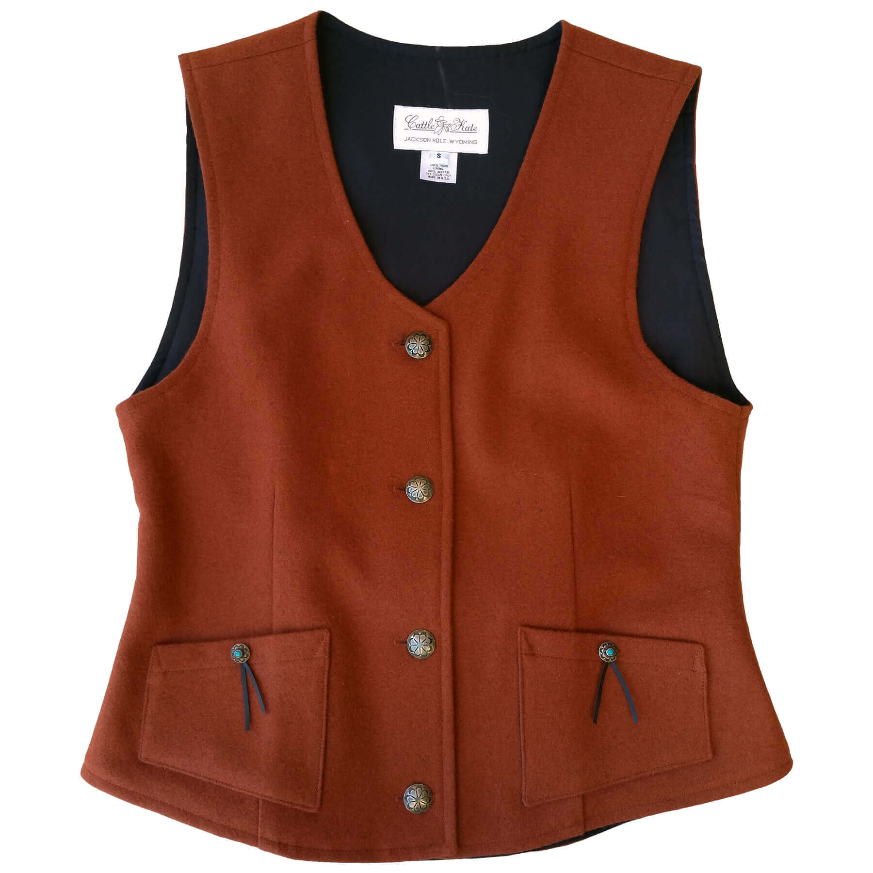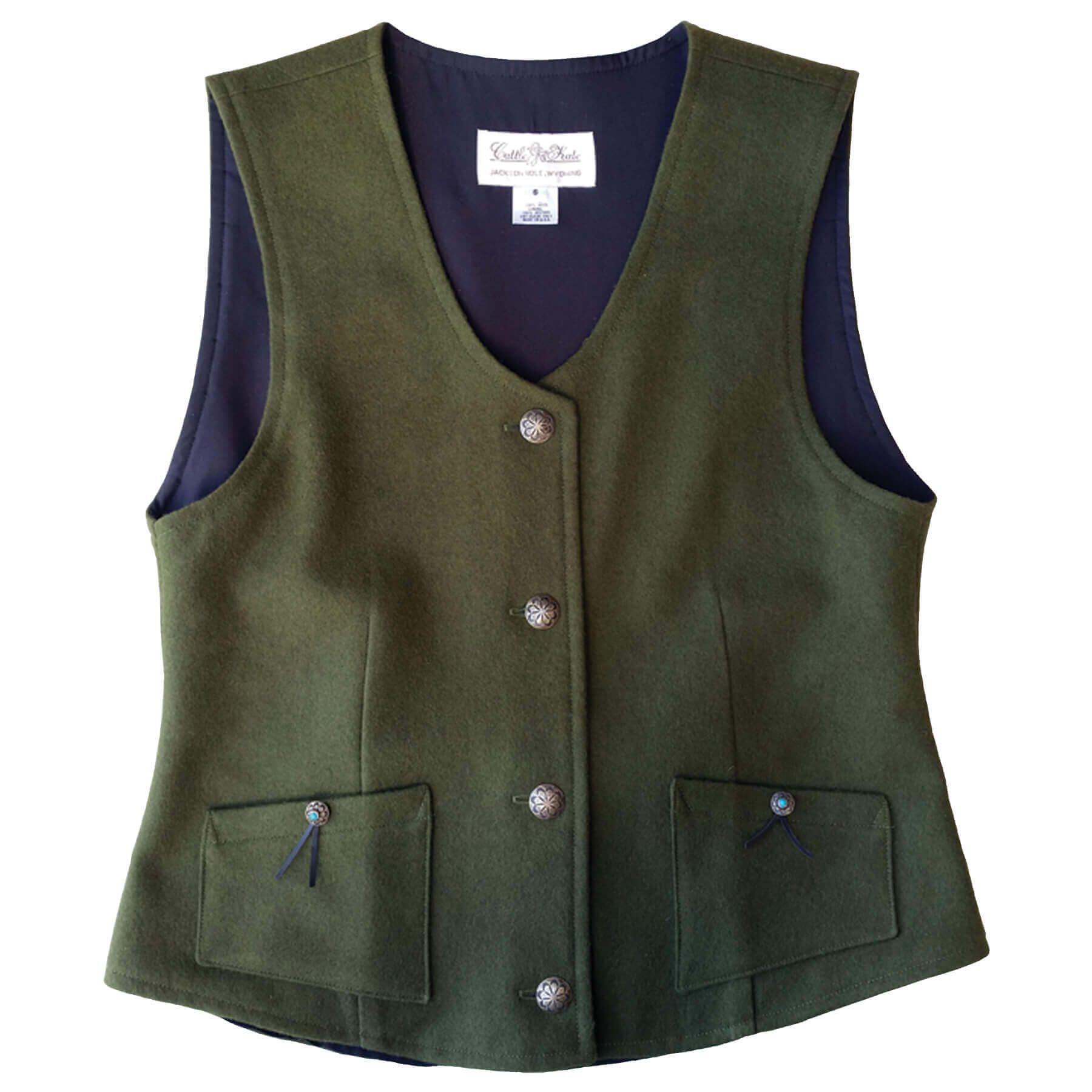 Every western closet needs a western vest and yours needs this one. Antiqued-Nickel Concho buttons (matches our Maybelle Gore Skirt) make a beautiful statement on warm olive or rich-rust colored 100% Melton Wool. Slightly smaller Conchos with a turquoise centered stone wrapped with a leather lace give the final touch to the slightly angled pockets. Adjustable belt in the back for a comfortable fit. Lined in Polyester. Dry Clean Recommended. Made in USA.