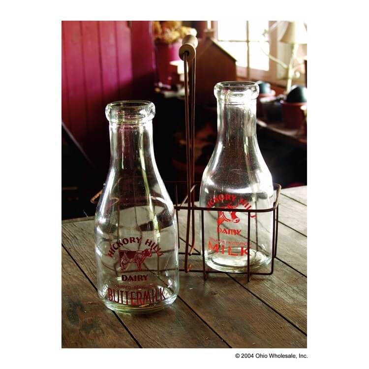 Country living and days on the farm are represented by these glass milk bottles. Featuring the name Hickory Hills Dairy stamped on each bottle the containers come in a metal carrier with a wooden handle.