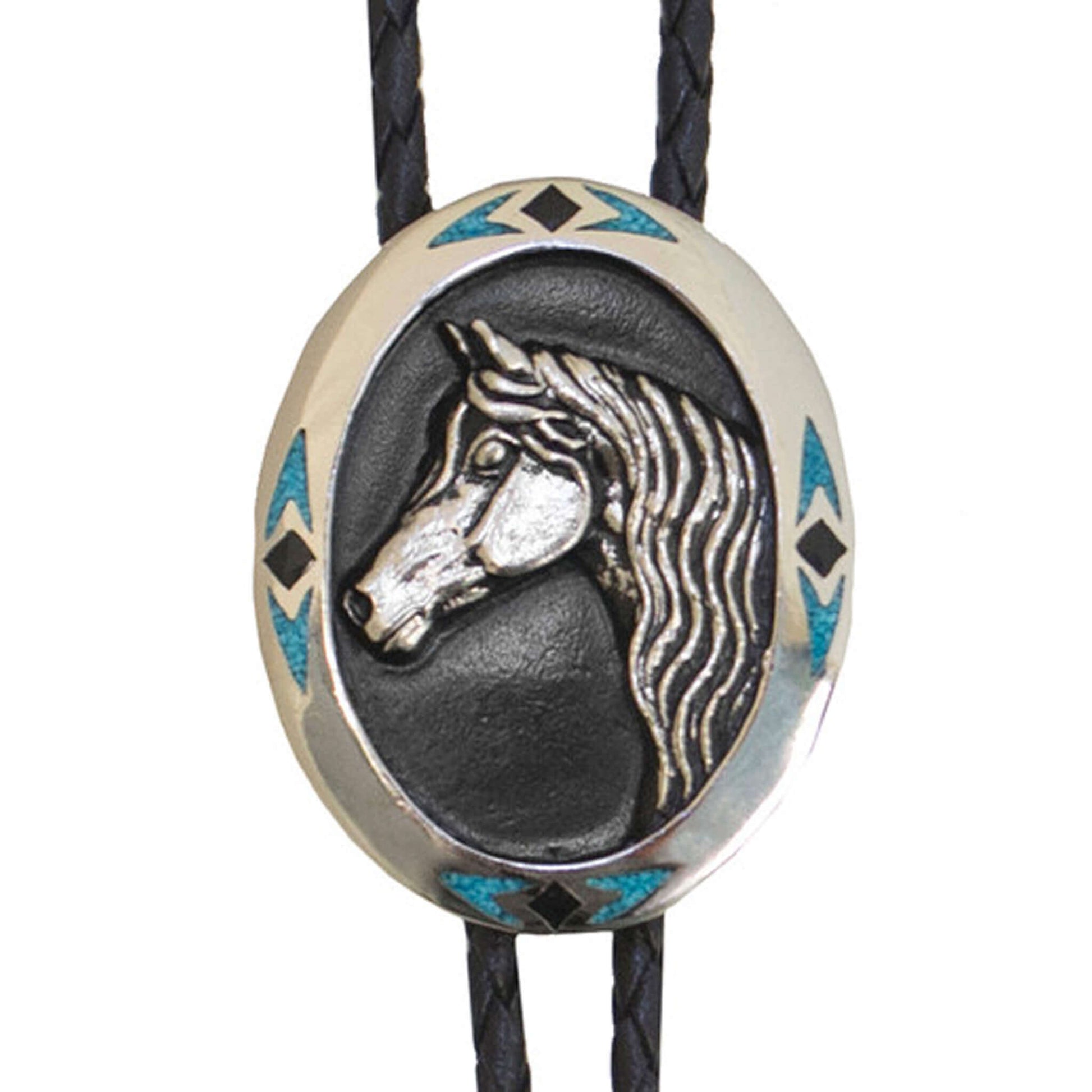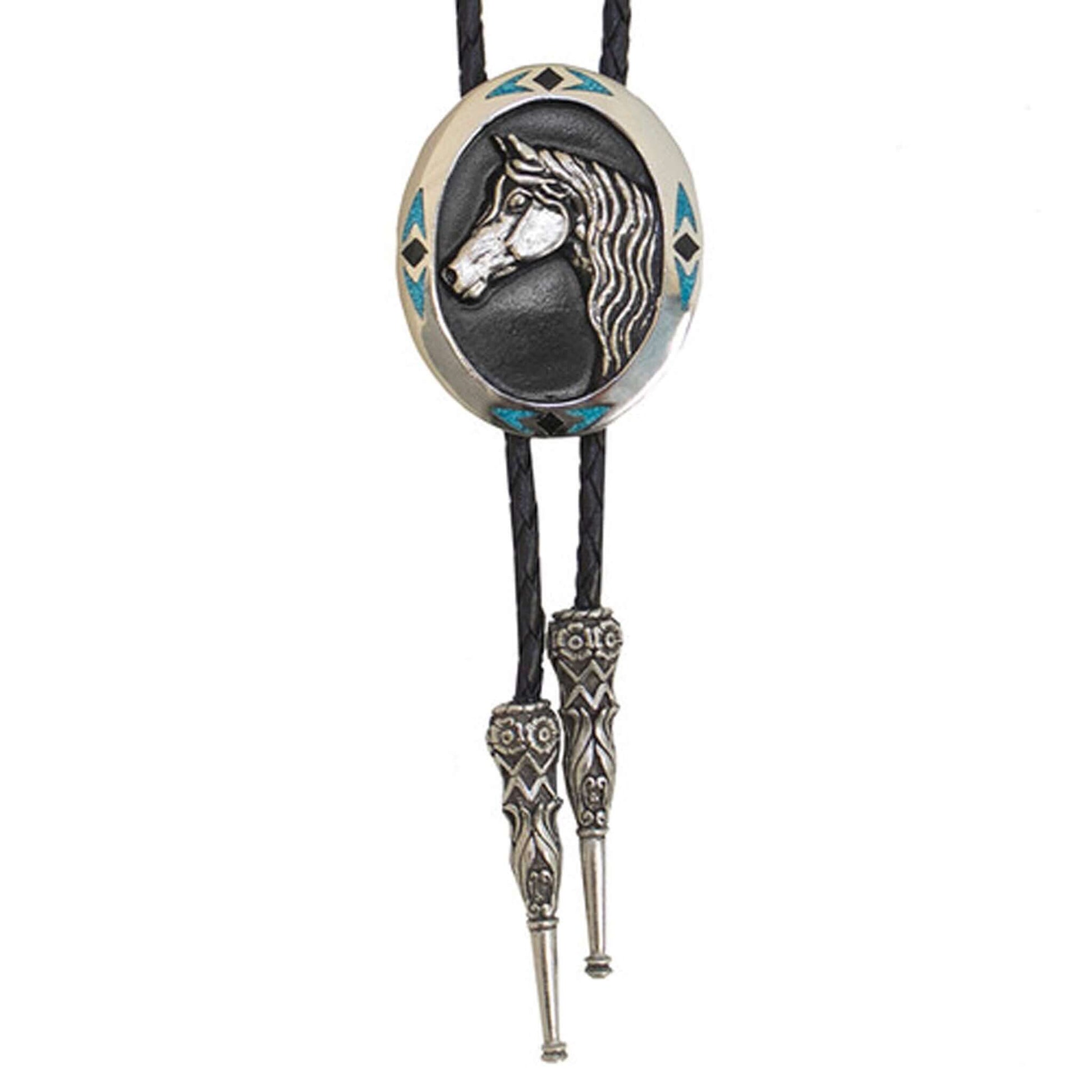 A lovely horse head design is featured on this bolo tie made of lead-free pewter with a turquoise chip inlay. Bolo tie cords are 38" long and feature finely detailed Victorian style bolo tips with a hand-carved look. Made in the USA. Measures 1.5 in x 2 in
