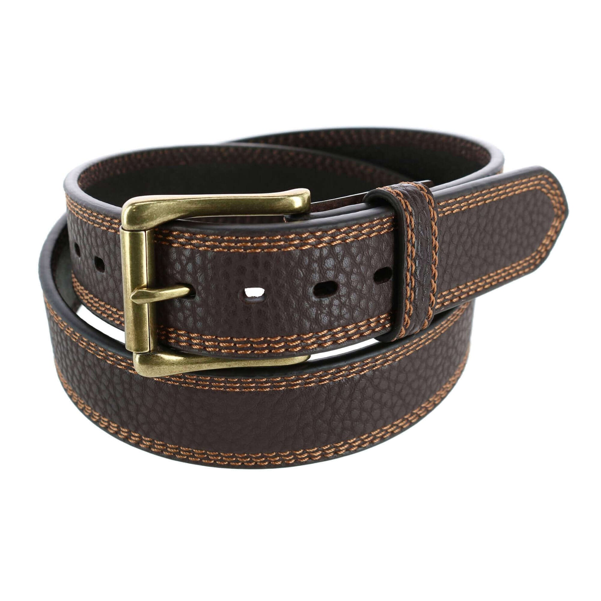 Simple leather design quality cowboy belt. Pebble grain genuine leather. Roller bar buckle in antique brass finish. 1-1/2" wide with removable buckle.