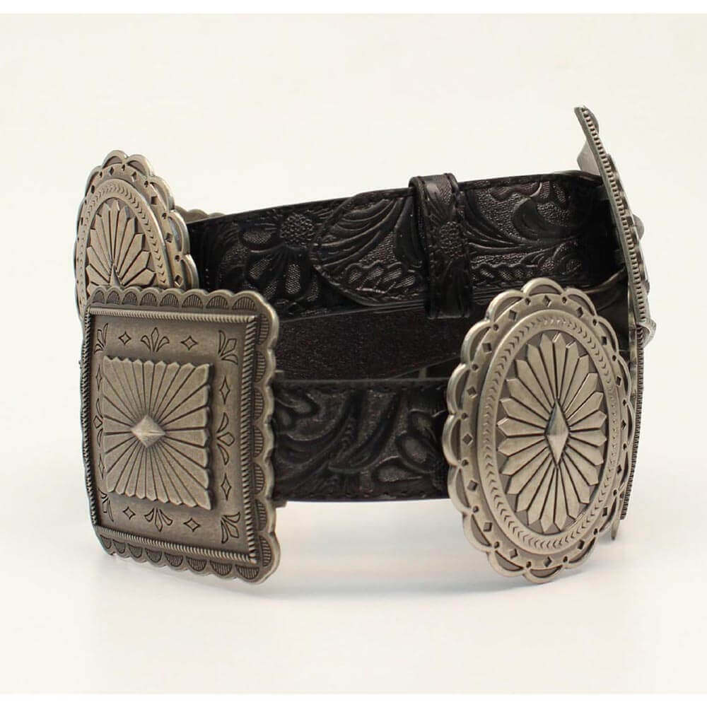 This ladies cowgirl belt has a stylish western look. The 1-1/2 inch black embossed strap has large alternating oval and rectangle antique silver western Conchos. This belt is perfect for a night on the town.