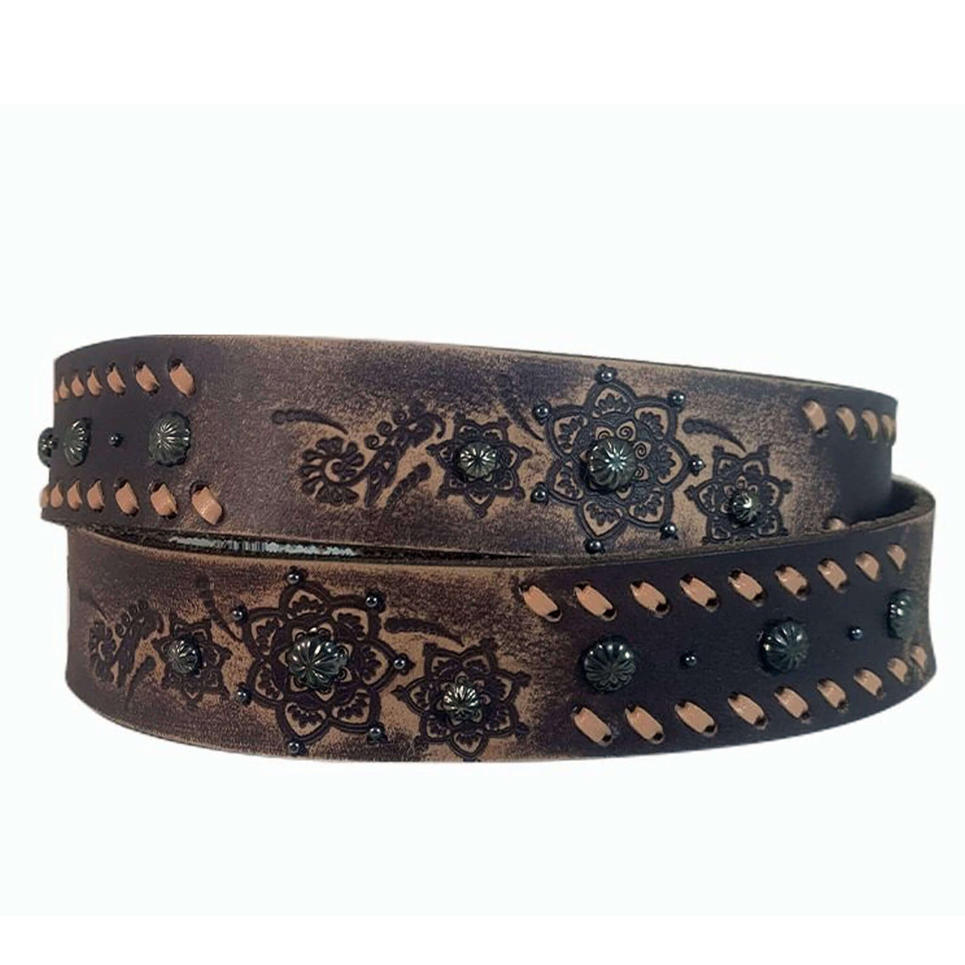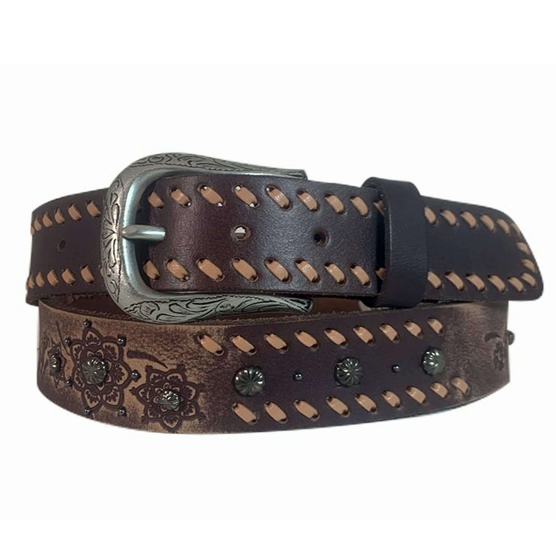 Show your love of the western lifestyle with this distressed genuine leather, floral emboss design, and silver finish buckle. This belt is the perfect complement to a western style wardrobe. 1-1/2" wide.