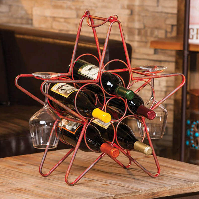 Display bottles of wine in this star wine bottle holder. Holds 5 bottles and two wine glasses. 19.75 x 19.25 x 6.75D. Imported. Very practical, well made also looks great!
