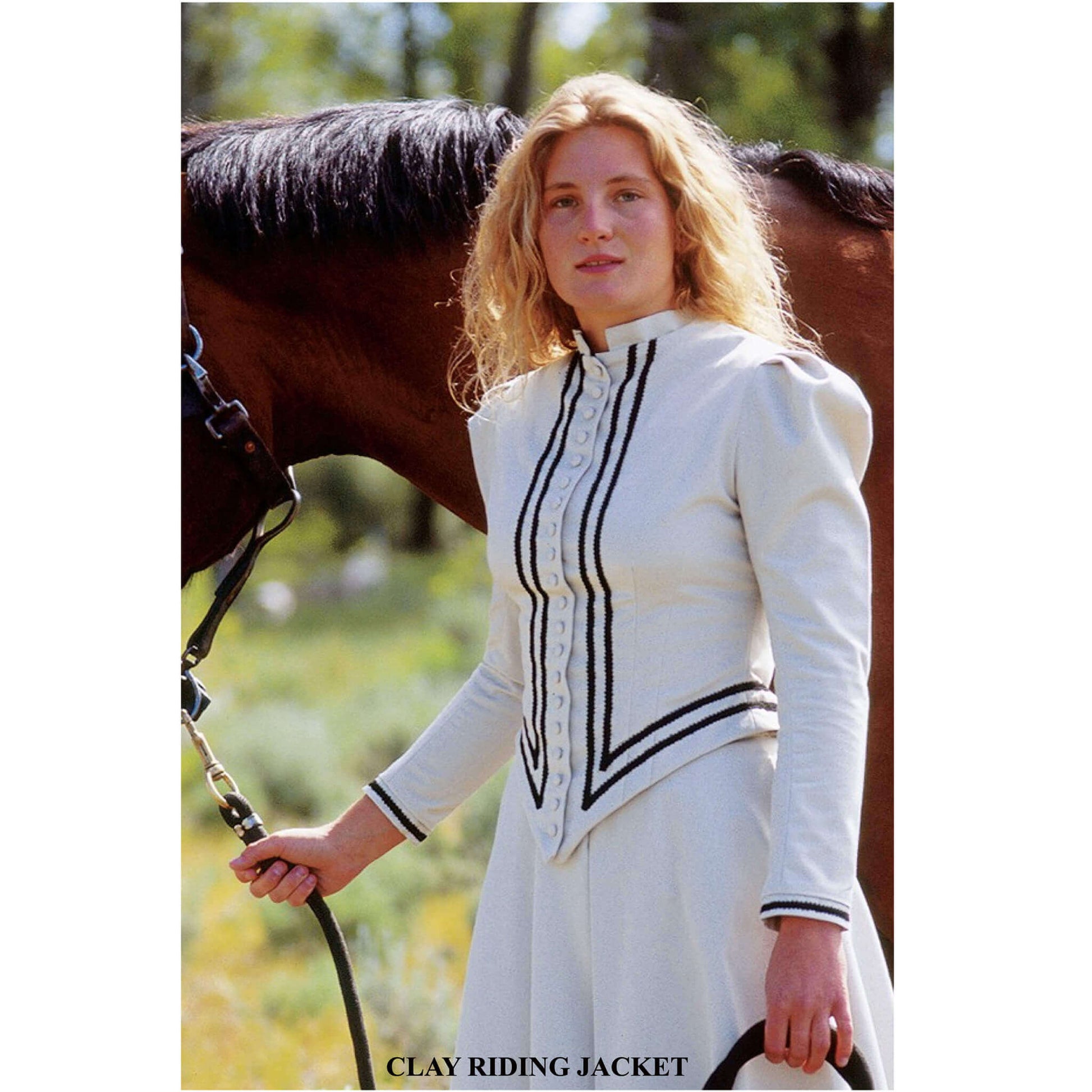Designed for the horsewoman, this classically tailored Riding Jacket looks handsome with or without the horse. The jacket is very fitted with soutache trim and fabric covered buttons. This jacket and our riding skirt together makes a wonderful combination of tailored fit and comfort so if you ride a horse or just want to look like you do, this is the outfit. 100% cotton twill. Dry clean recommended.