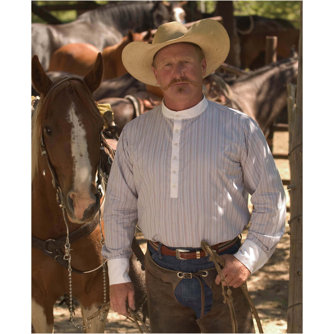 The uniform of the cowboy provided protection from the elements and comfort during many hours on horseback. This shirt will offer today's cowboy a comfortable, cool version of the uniform once worn. This pullover shirt features a button down front placket, two button closure cuffs and a band collar in white contrast. Shirt is made from fine cotton in a blue and khaki stripe design. Made in USA