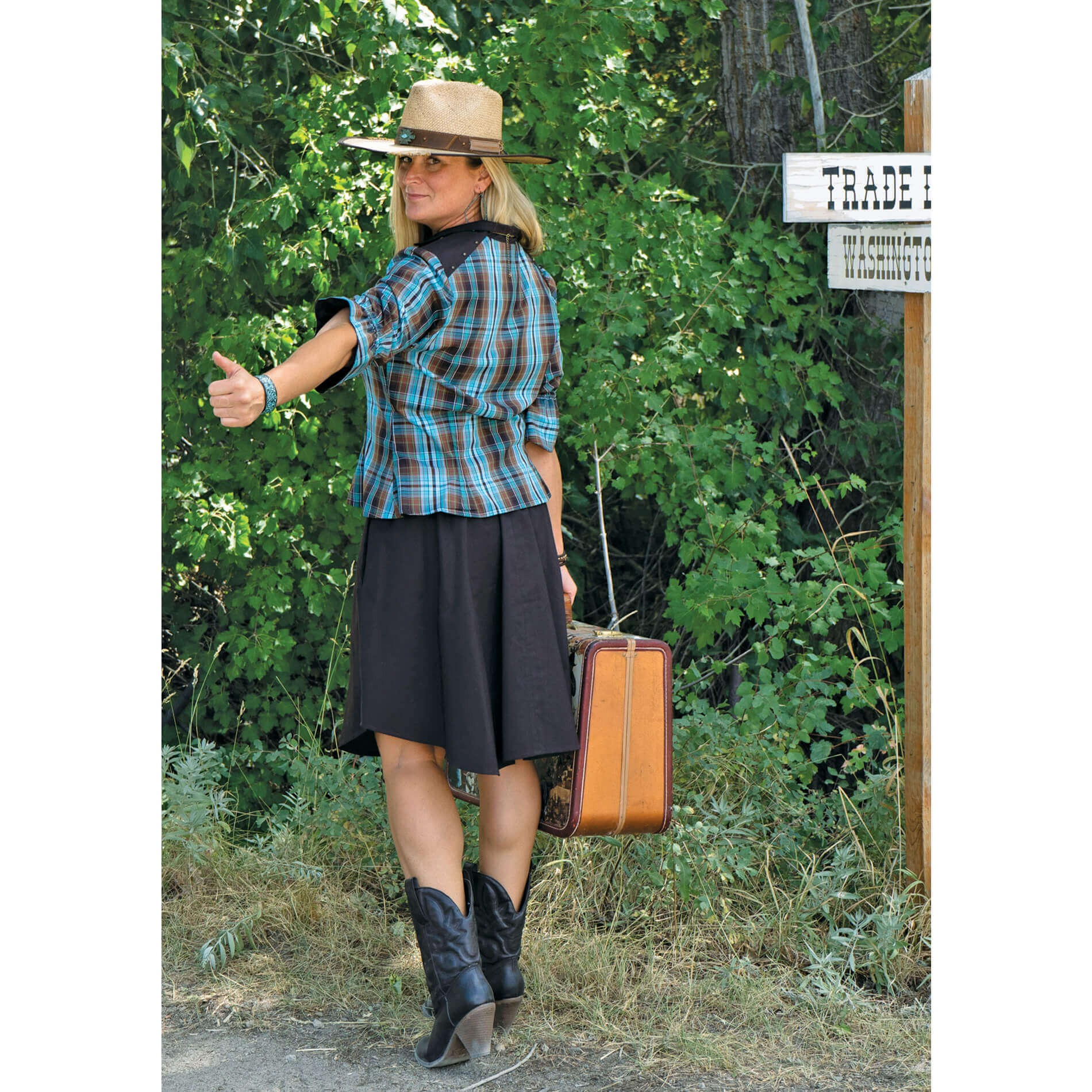 Kick up your boots in a line-dance wearing this short western swisher skirt! Designed with comfort and style in mind. The skirt is a full cut style that is lined, has an elastic band in the back and two side pockets. Skirt front has a western style yoke with accented brass studs. 100% Cotton lined in polyester. Made in USA.