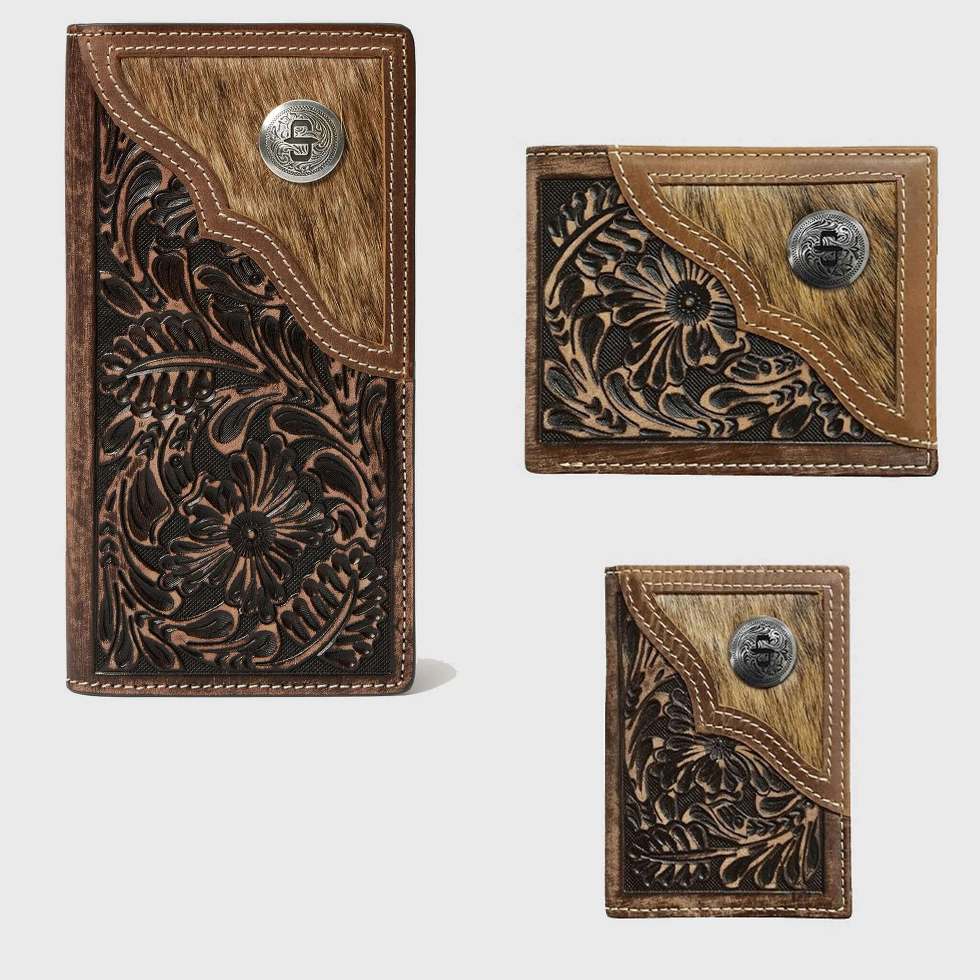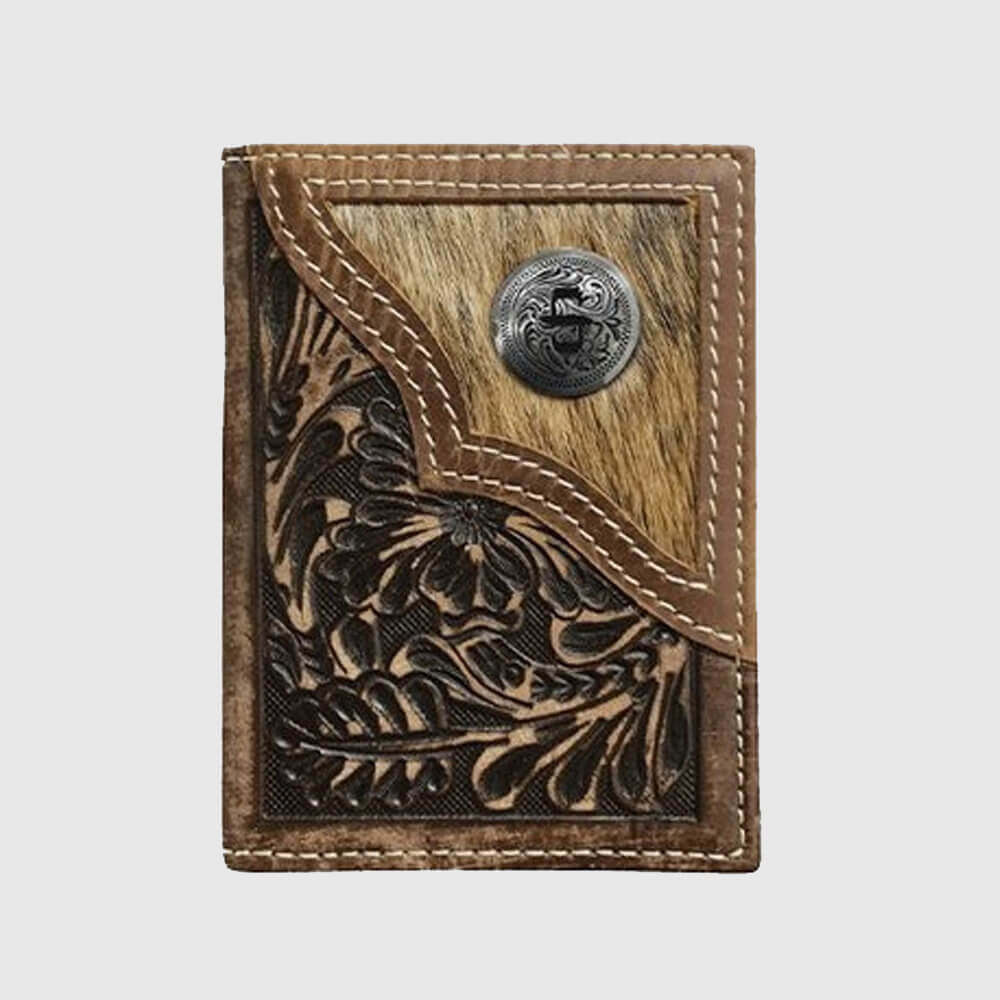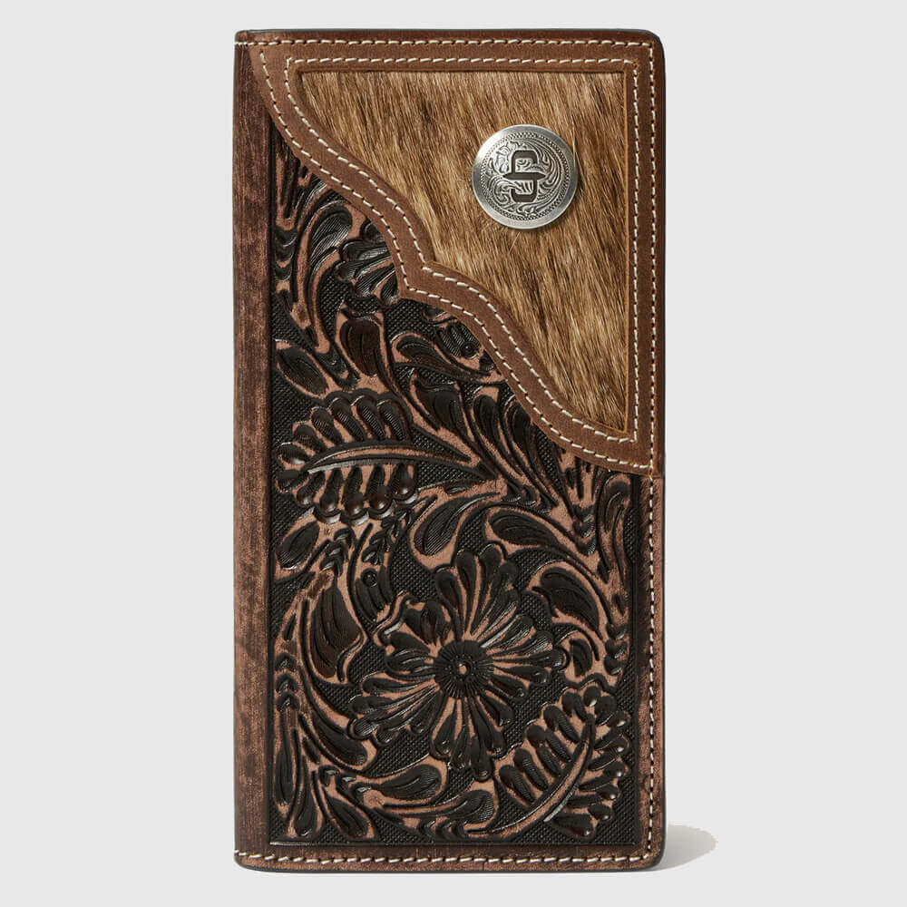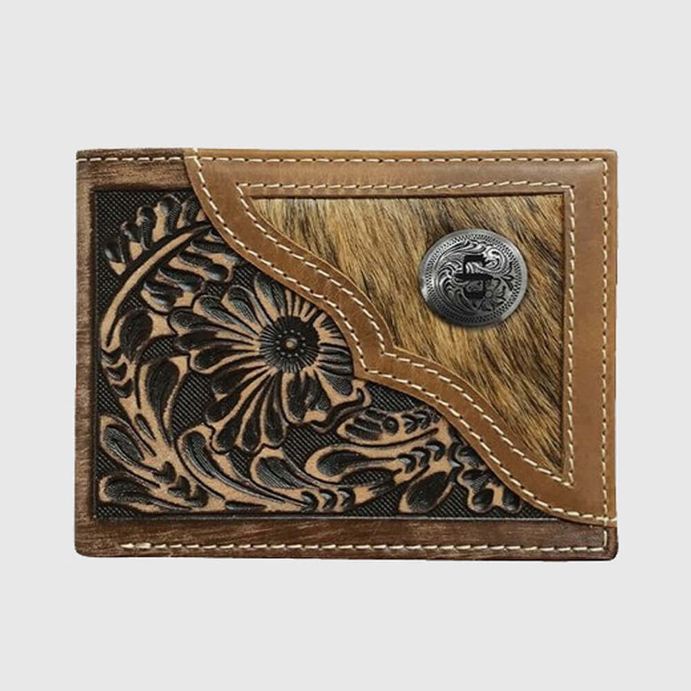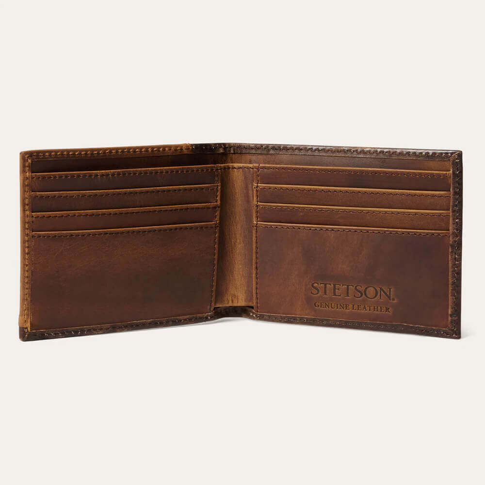 Made from top-grain leather, these wallets feature vintage brown tooled, hand-sanded brown leather with a brindle hair-on-hide inlay and silver-tone Stetson Concho. At once rugged and refined, each of our wallets embodies our legendary commitment to quality and attention to detail.