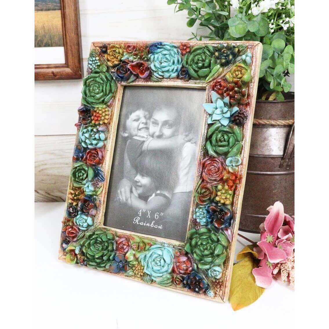 Western décor is all about bringing together the desert beauty of the southwest and all its inhabitants with rugged cowboy charm and rustic good looks. This photo frame features beautiful floral cactus succulents in delightful colors. Cactus Succulents picture frame is made of designer composite resin, hand painted and polished individually. This Cactus Succulents Photo Frame measures 9" Tall, 7" Wide and holds 4" by 6" photos. Imported.