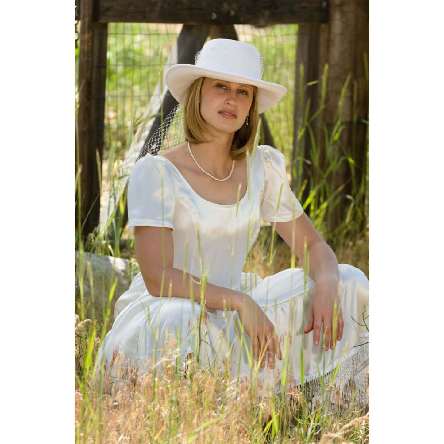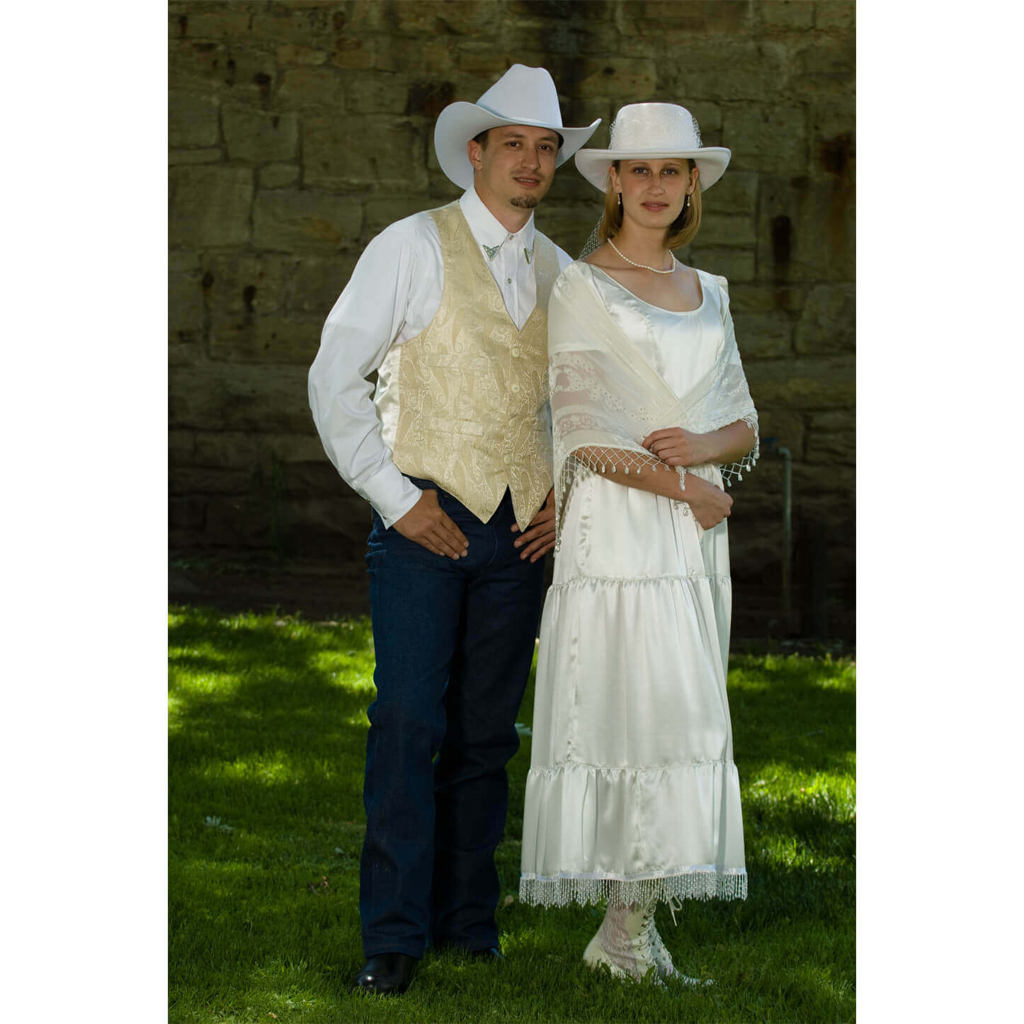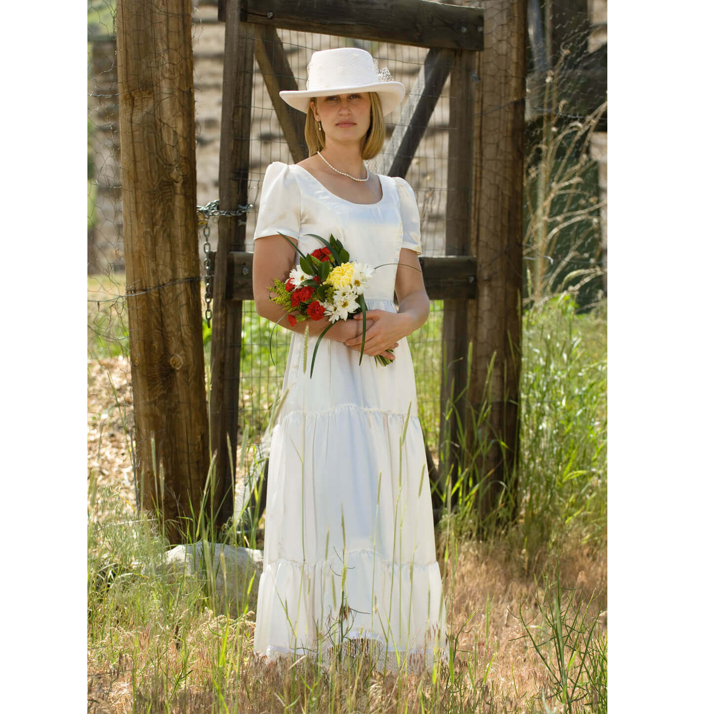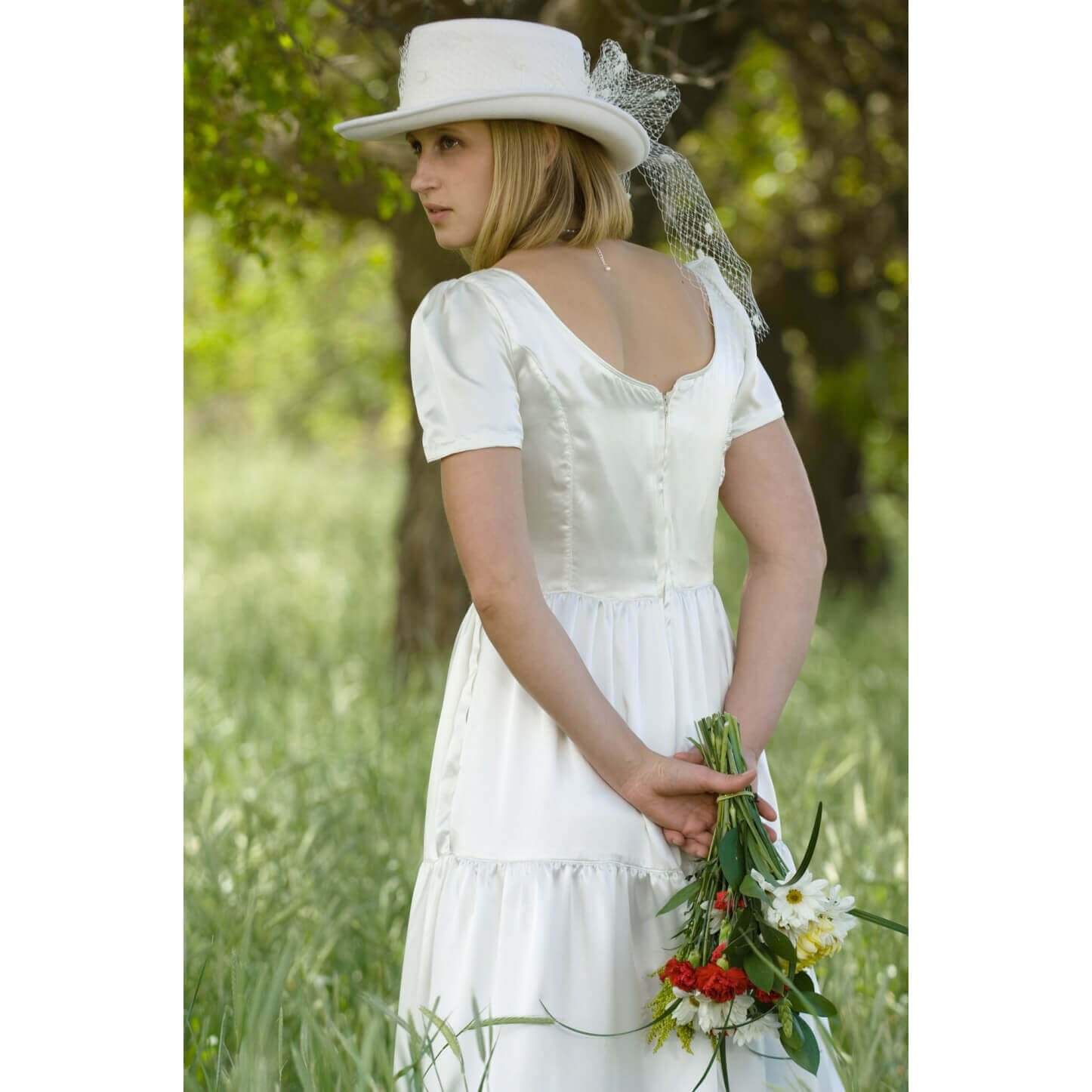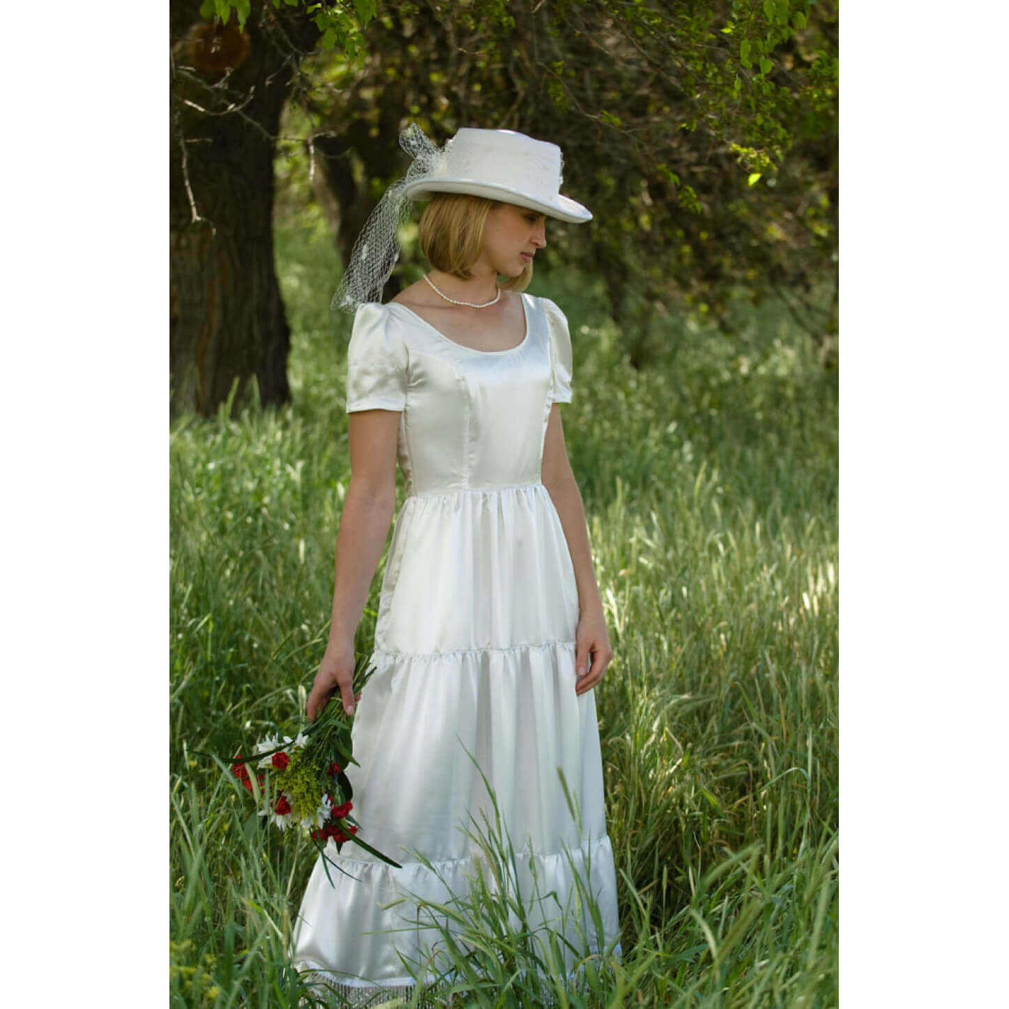 This dress is simple and easy to wear. A slightly raised waist, the design is simplistic which makes it a great blank canvas. Any accessory will compliment the design depending on your style. Add a sleek string of pearls, lace gloves, sash or belt. Low swoop neckline and short sleeves are detailed with self piping while the bottom tier is hemmed with 3" ivory beaded fringe. The three tiers gather nicely and give it a fullness you can dance and twirl all night. 100% Silk Charmeuse.
