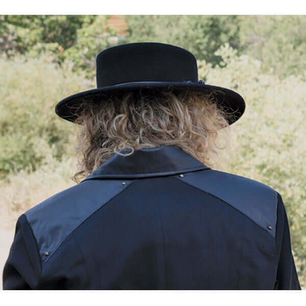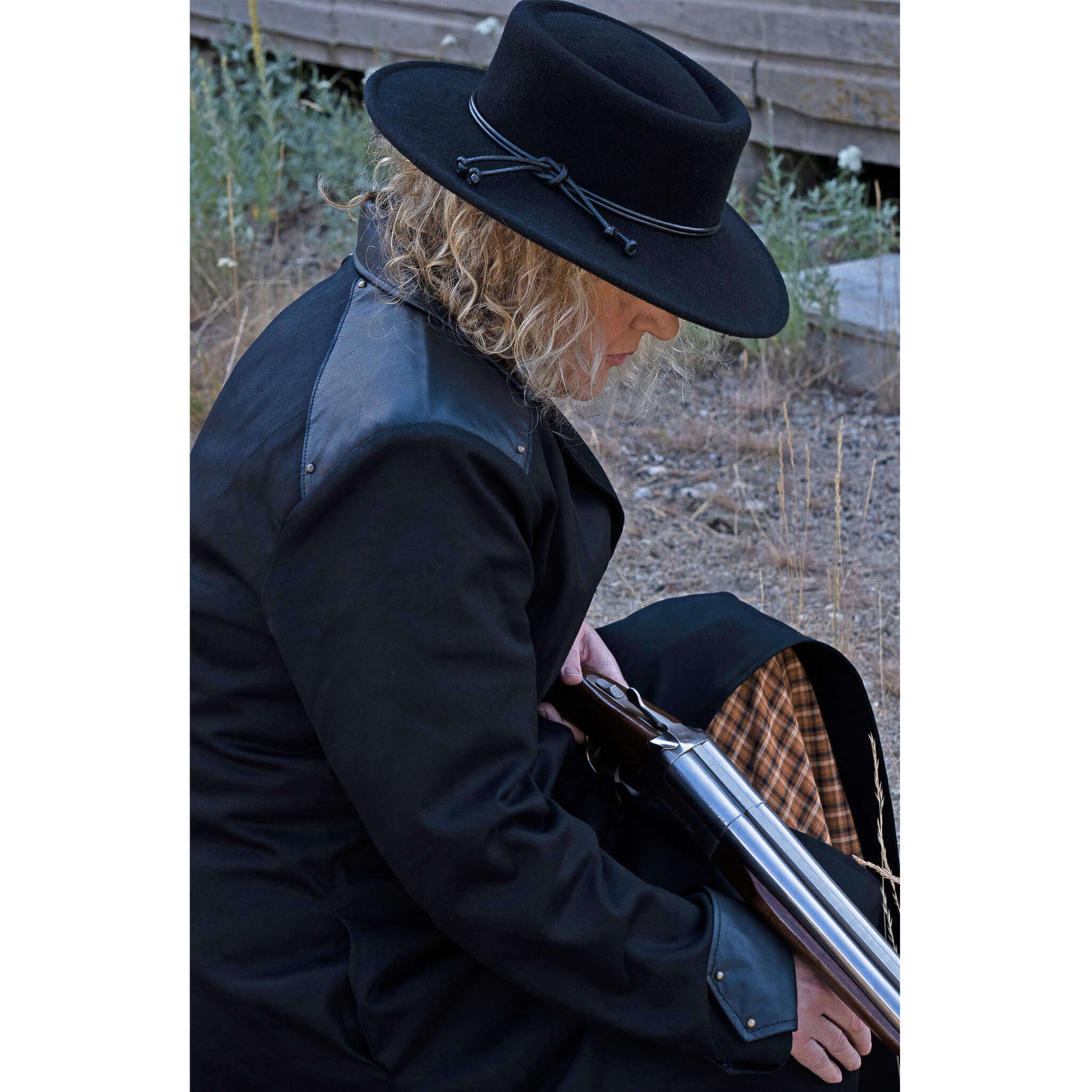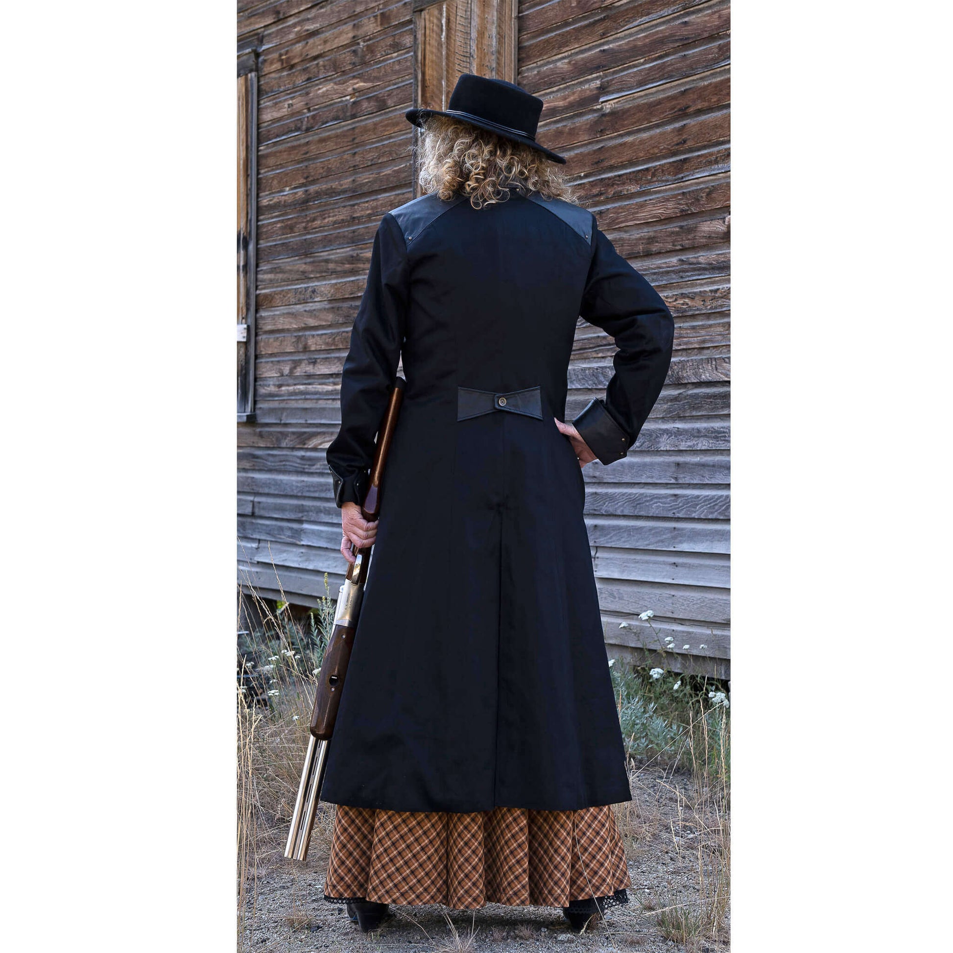 We have made an exquisite long western coat for the ladies. Perfect for the chilly days in the barn, on a horse ride, or a trip to town. It has the toughness of a man’s coat but designed for the ladies. Features a leather collar, yoke and cuffs detailed with brass studs. The Trail Blazer coat is split up the back with a decorative black leather belt that defines the waist. Constructed of black cotton twill, leather accents and lined in a heavyweight satin flannel. Dry Clean. Made in USA.