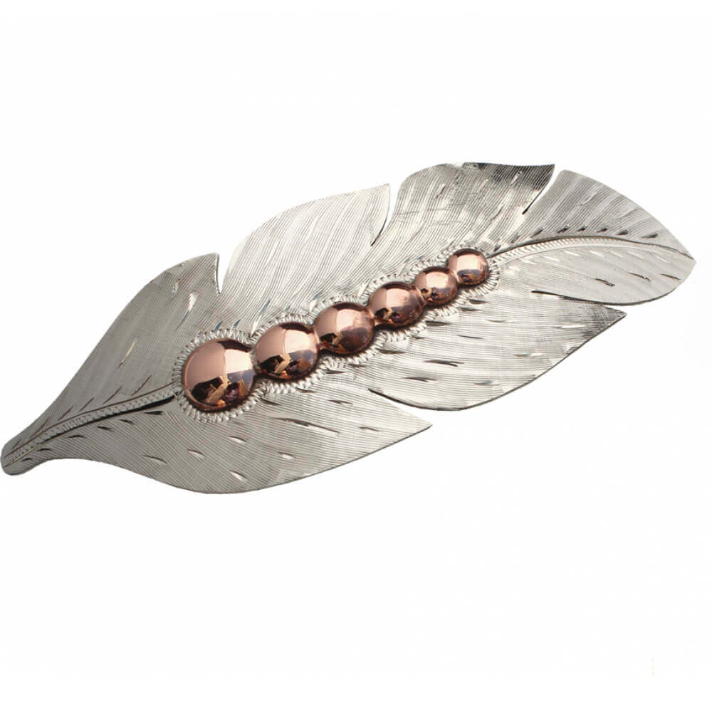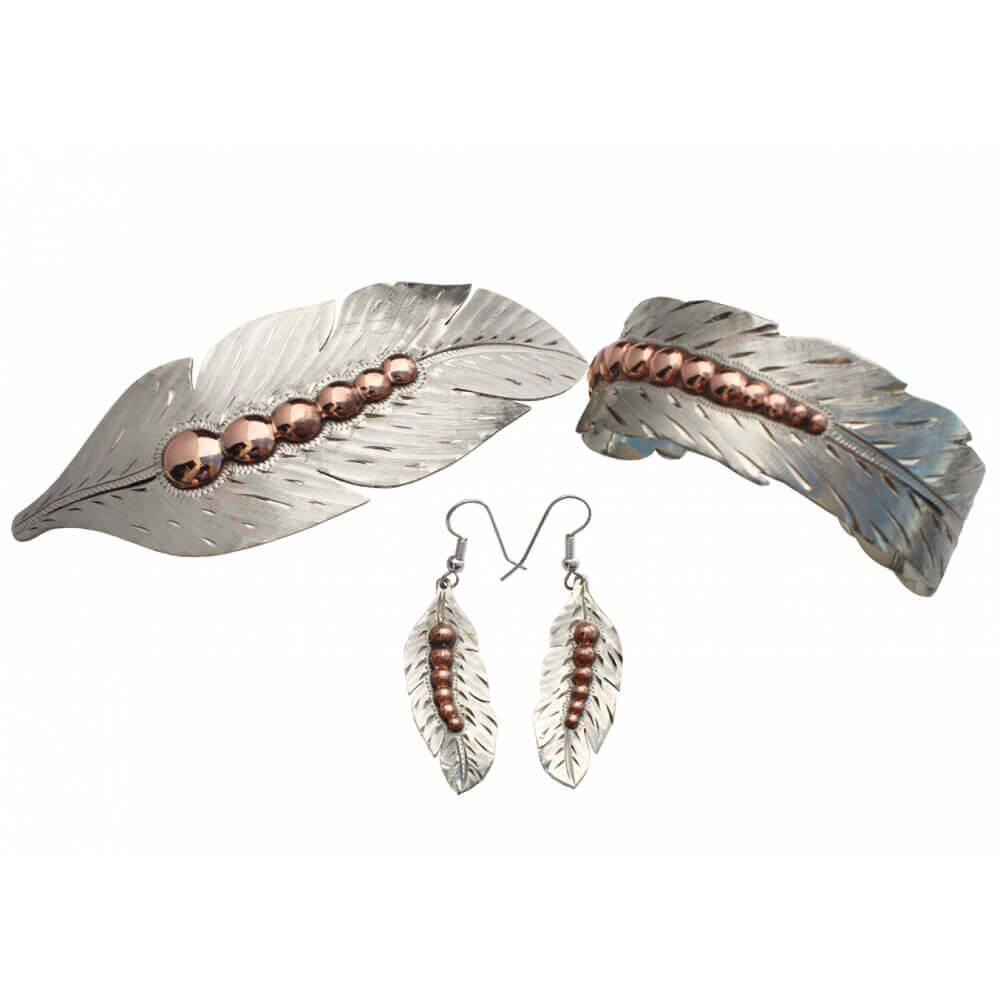 You’ll feel fabulous wearing this feather jewelry! Each piece has a bright silver with a copper finish accent along the shaft that captures and reflects the light with every turn. Made of sterling plated German silver and copper. 1-3/4" x 4-1/2"