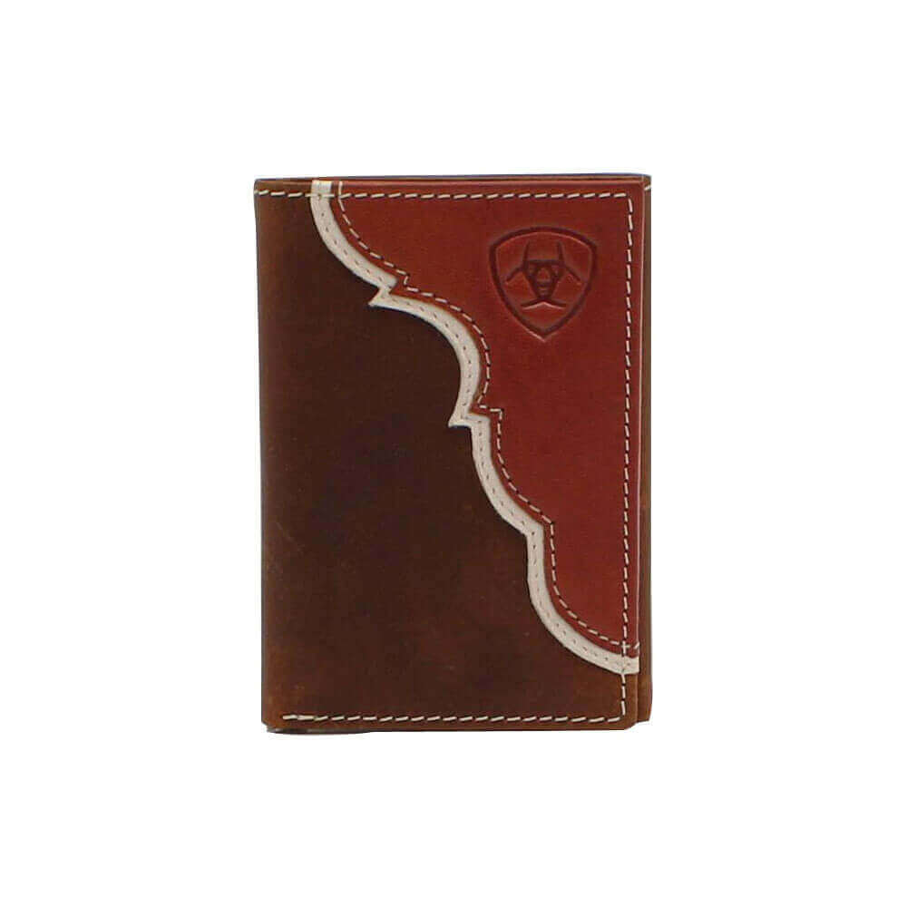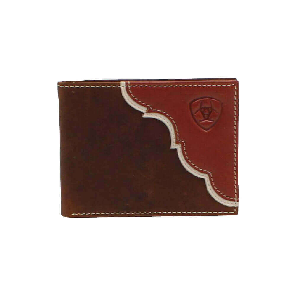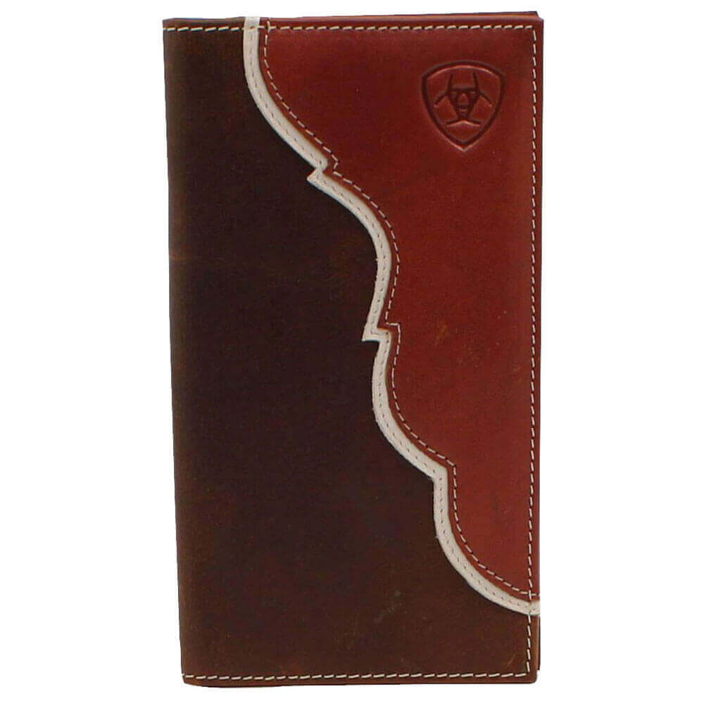 Stay organized in style with this rodeo style cowboy western wallet. Genuine two-tone leather with white underlay and features an embossed Ariat shield logo the upper right corner. Crafted with top grain leather and features multiple compartments for your credit cards, cash and ID.