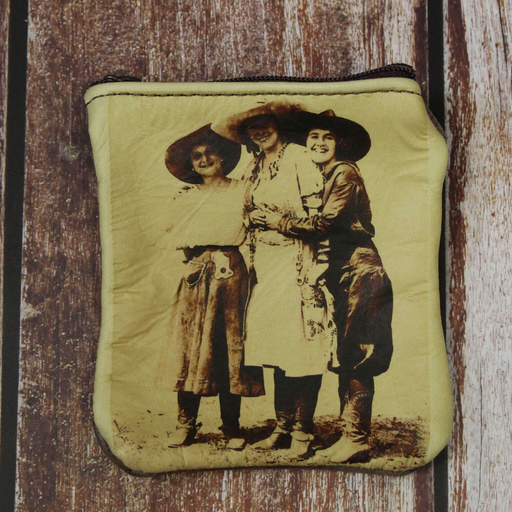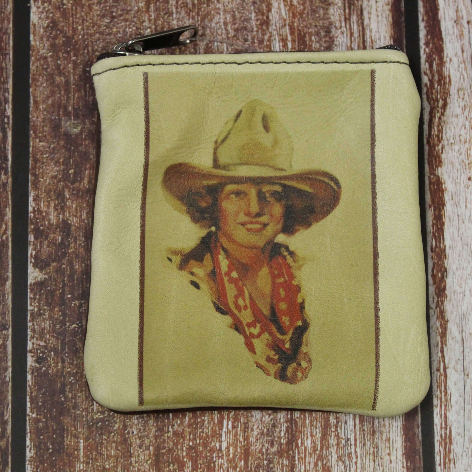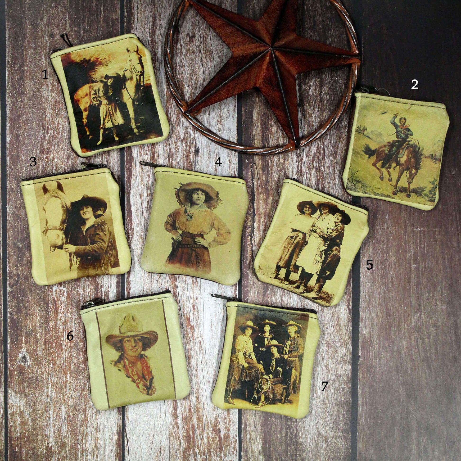 A great little organizer you’ll want with you everywhere you go. Made of soft leather and measures 4” x 4-½” in vintage cowgirl prints with zipper closure. Images may vary in color and size.